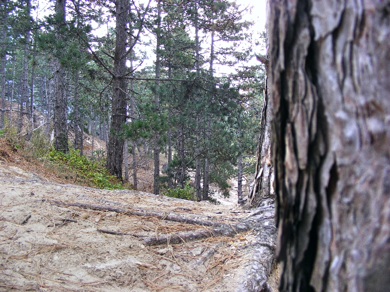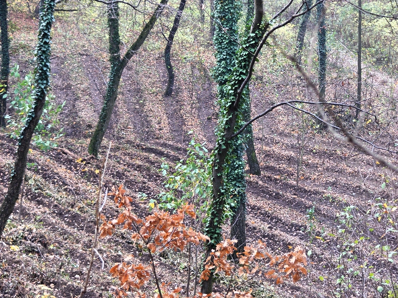 Egy nap alatt jót változott az időjárás. Tegnap Esztergomban még melegünk is volt a napsütésben, most meg a borongós, párás időben szinte már fázunk. Kedvencem, az emelkedő sem segít abban, hogy kimelegedjünk, mert egyelőre lefelé visz az út. Az erdő elég saras. Helyenként komolyan balettozni kell, hogy a nagyobb dagonyákat kikerüljük. Azért valahogy megoldjuk. Kata rengeteget fényképez, mohás fatuskót, kérgeket, csiganyálas levelet, faodút…