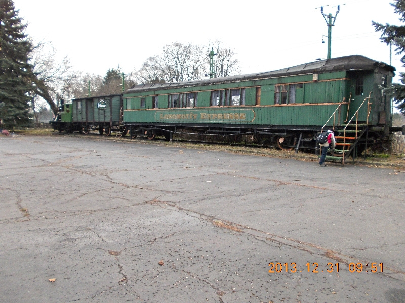 Fél tíz után érünk Nagykanizsára, miután az első vonatok egyikével elindultunk Szolnokról. Jó hosszú nap lesz! Az állomás épületből kilépve, mindjárt a szívemnek kedves objektumot pillantok meg, a Vasúti parkot. Most azonban csak futó pillantást vetek rá, mert visszafelé jövetben tervezzük alaposabban szemügyre venni és akkor akarjuk az itt rejtező ládát is megkeresni. Gesztenye fák alatt megyünk, akarom mondani korzózunk, mert a helyet Bécsi korzónak hívják. Keresztezzük a Szombathely felé vezető vasúti síneket, majd elhaladunk az egykori Kanizsa Bútorgyár mellett, mely ma is hasonló profillal üzemel. Eszembe jut egy régi emlék. Egyszer még hajózó koromban, a nyolcvanas évek közepén, Kaszópusztán töltöttem a kötelező rekreációs pihenésem. Meglátogatott áldott állapotban lévő felségem is, akivel együtt, elhoztak bennünket ide gyárlátogatásra. Mint fiatal házasok, érdeklődéssel figyeltük a bútorokat, mert a gyerekszoba berendezése előtt álltunk. Azonban olyan tré munkát láttunk a gyárban, hogy egyöntetűen eldöntöttük, Kanizsa bútort soha nem veszünk. Remélem azóta javult a gyártás színvonala! Az Asszonyt is ki kellett cserélni 20 év után, így most egy másikkal ballagok a városközpont felé. Ahogy megyünk tovább, újabb gyöngyszemen akad meg a tekintetem. Egy udvarban, három járműből álló vasúti szerelvény van kiállítva. Igazi különlegesség! Régi szertartályos gőzös paklikocsival és egy négytengelyes pullman kocsival, mely láthatólag vendéglátó helyként funkcionál(t). Kicsit érdekes összeállítás, mert ez a gőzös az étkezőkocsival így együtt sosem futhatott, de igen látványosak. Csak a rozsda ne enné őket! Sajnos a hely láthatólag nem üzemel, pedig szívesen innék benne valamit, ha már Szilveszter van! Budapesten, a Déli pu. mellett álló étkezőkocsiban enni-inni is különleges élmény, amit volt szerencsém kipróbálni. Alaposan körbenézem és fotózom, majd indulunk tovább.