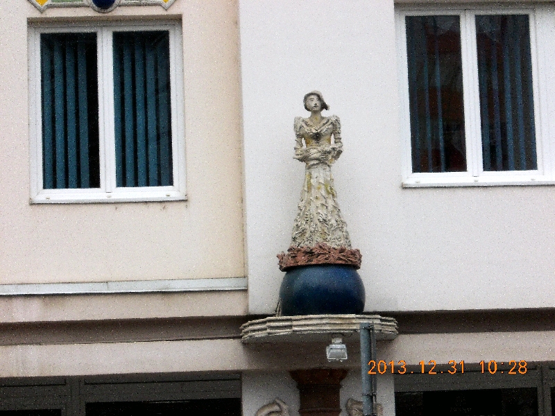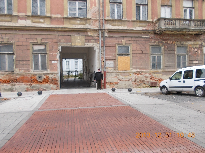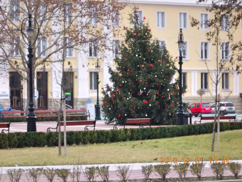 A városközponthoz érve, a Fő útra fordulunk, mely egy meglehetősen széles térbe torkollik. Itt már van némi élet, mert idáig nem sok emberrel találkoztunk. Elvétve még trombitaszó is emlékeztet, hogy Szilveszter van, de valahogy inkább a hétköznapi jelleg dominál, nem a szilveszteri. Elsétálunk egészen a körforgalomig, ahol az első “láda” található. A ládaoldal minimál leírását ide másolom, mert idáig nem sok ilyen semmitmondó leírással találkoztunk.