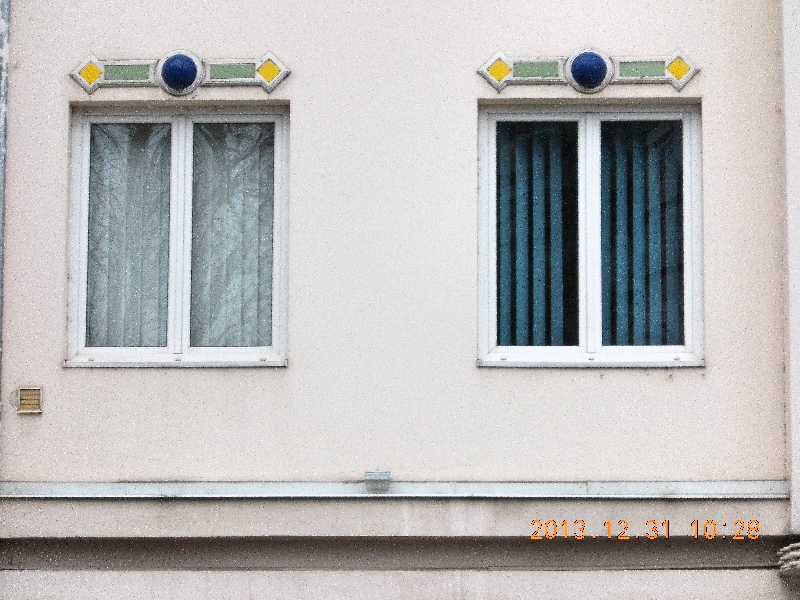 Belogolok, megvan a találat. Elgondolkodom, hogy miért pont egy Kft nevét kellett jelszónak választani? Talán a rejtőnek valami kötődése van hozzájuk? Kicsit olyan promóciós szaga van a dolognak. Nem sokat meditálunk, indulunk tovább, de előtte még megcsodáljuk a sarki társasház kerámia díszeit. Érdekesek. Ritkán díszítenek manapság ilyesmivel egy házat, pedig nem látszik réginek.
