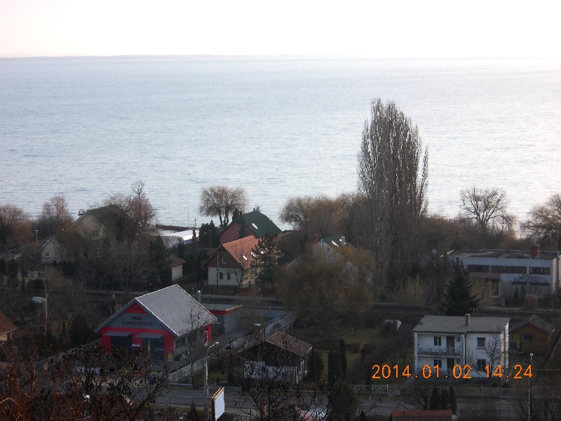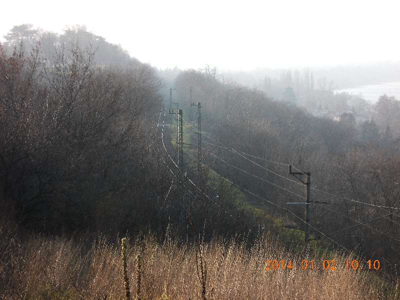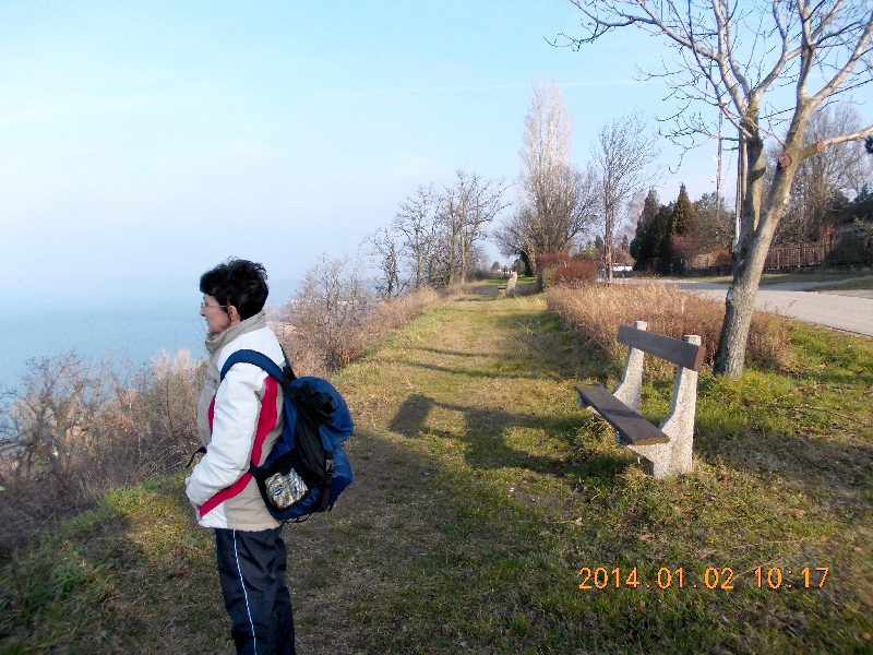Egyébként is, a mai túránkat a Magaspart jegyében terveztük. A Balatont és az alacsonyabban fekvő utcákat vastag páraréteg borítja. Egyelőre nem sokat látni a tóból, de később majd jobb lesz, reménykedünk. Párhuzamosan megyünk a vasútvonallal. Néhol látszik a felsővezeték-tartó oszlopok teteje és időnként eldübörög alattunk egy-egy vonat. Csak a hangjából hallom, hogy tehervonatok. Na igen, személyvonat ritkán jár így télen.