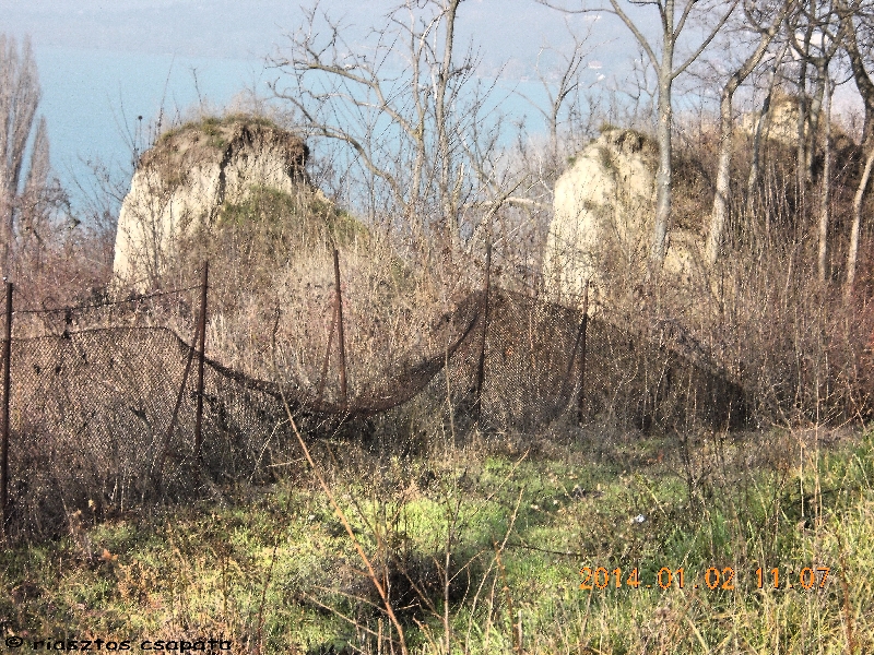 Ezeket is megnézzük, majd a park elfogytával egyre urbánusabb környezetben folytatjuk utunkat. Eltávolodunk kicsit a vasúttól és a parttól. Elmegyünk egy bezárt étterem előtt. Persze, télen alig van hely, ami nyitva tart. Úgy terveztük, hogy valahol ebédelünk, de ebből lehet, hogy semmi sem lesz. Szerencsére számítottunk erre és konzervet is hoztunk. Majd egy alkalmas pihenőhelyen megesszük, ha nem találunk jobbat. Innen már jelzett úton megyünk, ismét megközelítve a partot. Igazán közel nem lehet menni, mert alattunk a Club Aliga, az egykori pártüdülő elzárt területe fekszik. A sok helyen letaposott kerítés mögött a lekopott löszrétegből kiálló keményebb kőzettornyok állnak. Érdekes látvány.