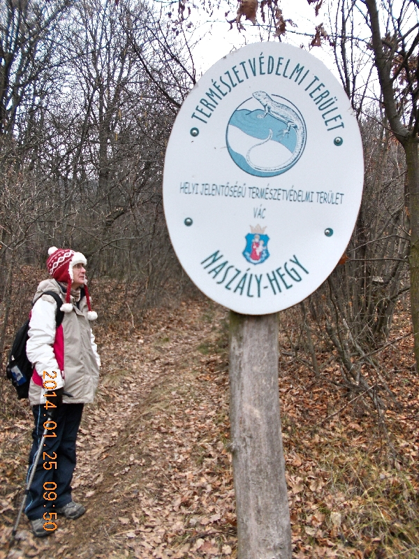 Találgatjuk, hogy mitől olyan. Havas lenne? Az nem lehet, mert akkor nem csak egy fotban lenne fehér a hegytető. Na, majd kiderül! Sajnos a párás időben készült kép, nem teljesen adja vissza a valós kontrasztot. Olyan 2-2,5 km-t megyünk az út melletti járdán, mire a Naszály lábához érünk. Itt elolvassuk a kihelyezett ismertetőket a Gombási agyagbányáról, valamint a Naszály-hegylábról és az itt található gyümölcsösökről. Dűlőutakon megyünk tovább. Valóban sok erre a gyümölcsös. Némelyik elhagyottnak tűnik és több helyen látunk ELADÓ táblát. Úgy látszik nem éri meg művelni, vagy a tulajnak nincs rá ideje. A kiöregedett gazdákat nincs aki váltsa, mert a fiatalok szétszéledtek a világban. A Hegyközségi feszület után lassan elmaradnak a kertek, beérünk az erdőbe. Aztán a Gombási elágazás után, már csak ösvény kanyarog a lábunk alatt. Természetvédelmi területre értünk.