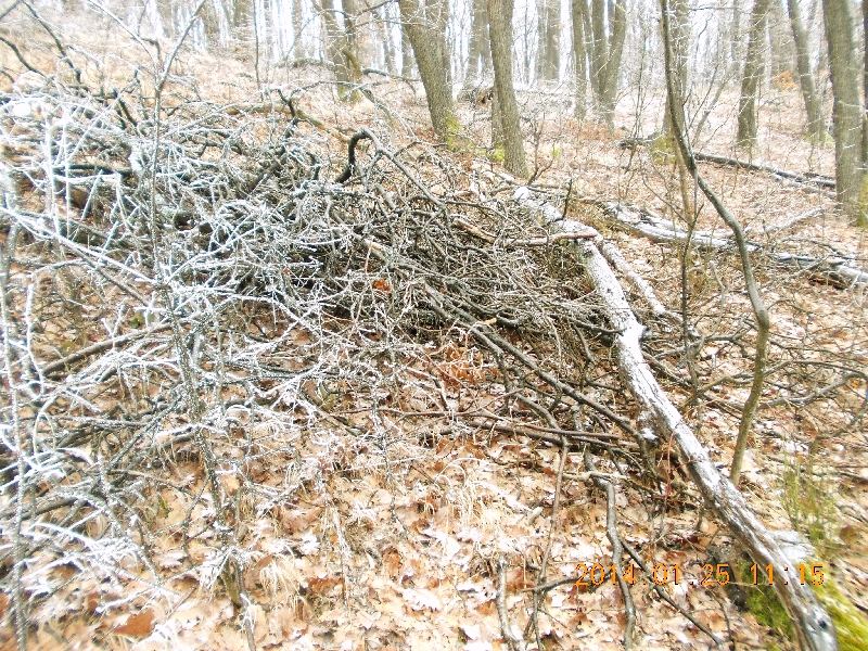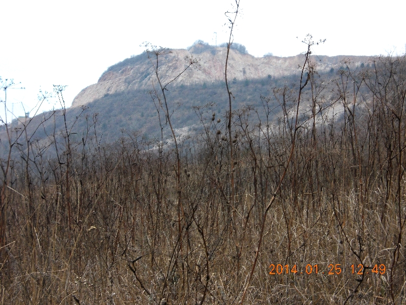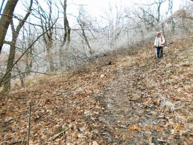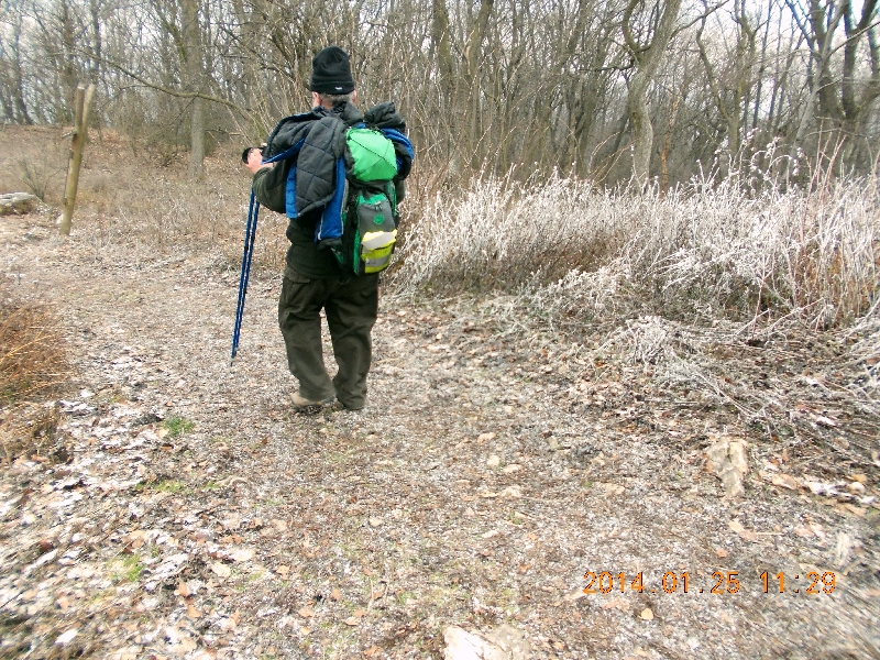Szóval a logolás után Nyugatra, majd Délre vesszük az irányt, hogy egy kört megtéve, visszatérjünk Vácra. A terep erre már szelídebb, azaz kevésbé meredek. Lassanként leadtam minden felesleges hőt, így a sapka visszakerül a fülemre (De rossz lehet az elefántnak, hiszen nincs sapkája. Mit csinál, ha fázik a füle?) és felveszem a kabátom. Ez alkalomból megállok, a botomat letámasztom. Közben lehajlok megigazítani a nadrágom szárát. A hátizsákom gondol egyet és mivel a csípőpánt már nincs bekapcsolva, átlódul a fejemen. Kibillent az egyensúlyomból. Teszek pár lépést előre, hogy visszanyerjem azt. Eközben sikerül a letámasztott botomat fellökni, majd rálépni. A bot két vége feltámaszkodott, de ahol ráléptem, kis gödör volt alatta, így szép ívben meghajlott. Íjnak egész jó lenne! Nagyjából kiegyengetem, de többet már nem lehetett összetolni. Sajnálom nagyon, mert attól a barátomtól kaptam, akivel Leveleken voltam. Támaszkodni még lehet rajta, megyünk tovább. Az agyagbánya felé vesszük az irányt, hogy közelebbről is szemügyre vegyük. Próbálok pár képet készíteni, de a párás levegő és a növényzet maradéka nem segít.