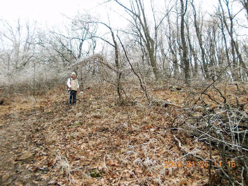 jelzést, amit követnünk kellene. De út sehol! Majd kiderül, hogy van/volt csak az erdőgazdasági út gréderezése közben, idővel elfogyott a feljáró. Most egy combközépig érő függőleges falon kell “fellépni”, hogy tovább mehessünk. Feltérdelve nagy nehezen felmászok, majd felcibálom Vé-t is. Egyhangúan megállapítjuk, nem erre kellene visszafelé jönni. Mászunk tovább az egyre meredekebb ösvényen. Leveszem a kabátom, mert a mínuszos hőmérséklet ellenére folyik rólam a víz. Vé egy újabb különleges tulajdonságommal szembesül, én fagypont alatt is tudok izzadni.