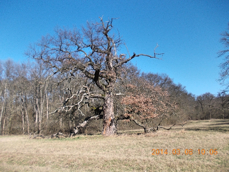 Miután körbenéztük a helyszínt, indulunk tovább. Egy csekély forgalmú országúton haladunk. Itt vezet a turistaút is. Egy kereszteződés után az elkanyarodik, mi pedig egy makadám úton megyünk tovább. Itt aztán már tényleg nincs forgalom! Zöldülő aljú erdő szélén ballagunk. Az Öreg Tölgy láda az utolsó logok alapján, feltehetőleg azért szűnt meg, mert a terület egy vadásztársaság tulajdona. Itt azonban semmi sem utal arra, hogy magánterületen járnánk. Néha találkozunk egy-egy terepjáróval, amit feltehetőleg vadászok vezetnek, de senki sem szól ránk. Egyébként is a vadászidény február végén véget ért. Az útról nem megyünk le, szerintem így senkinek sem lehet kifogása. Elhagyunk egy “Vadászkastély és Panziót”. Szóval, mégiscsak lehet erre járni! 10 óra felé lehet az idő, amikor az út mellett padokat és asztalokat látunk. Már alaposan megéheztünk, ezért döntünk: Lesz ami lesz, itt evés lesz! Úgy tűnik, hogy az asztalok a szomszédos vadászházakhoz tartoznak. Sehol senki, így megterítünk és nekilátunk a falatozásnak. Miután éhünket csillapítottuk, felszedelőzködünk és folytatjuk utunkat. Balról rövidesen feltűnik egy kerítés. Mögötte, ahogy olvasom a térképen, Vaddisznós-kert van. Igen, erről az egykori ládaoldalon is írnak. Vaddisznó sehol. Biztos télen mind agyonlőtték. Ja, így könnyű vadászni, ha a vad be van kerítve! Persze tudom, itt csak védett körülmények között tenyésztik ezeket az állatokat, hogy aztán exportálják, vagy vadhúsként eladják. Tulajdonképpen olyan,mint egy sertéstelep. A vadásztársaságnak jó pénzt hoz. Kata lányom is egy ilyen telepen dolgozott/lakott főiskolás korában, csak ott fácánt tartottak. A kerítés elfogy és feltűnik az ÖREG TÖLGY-HÖLGY.