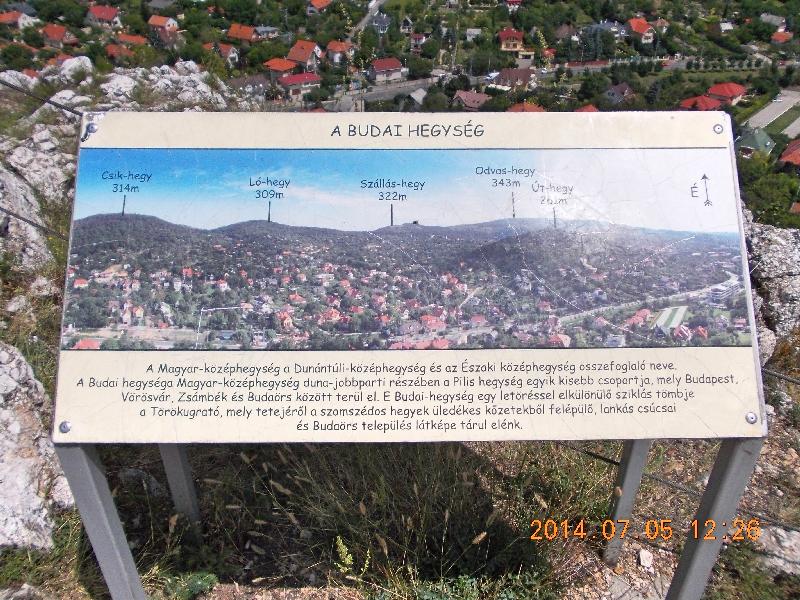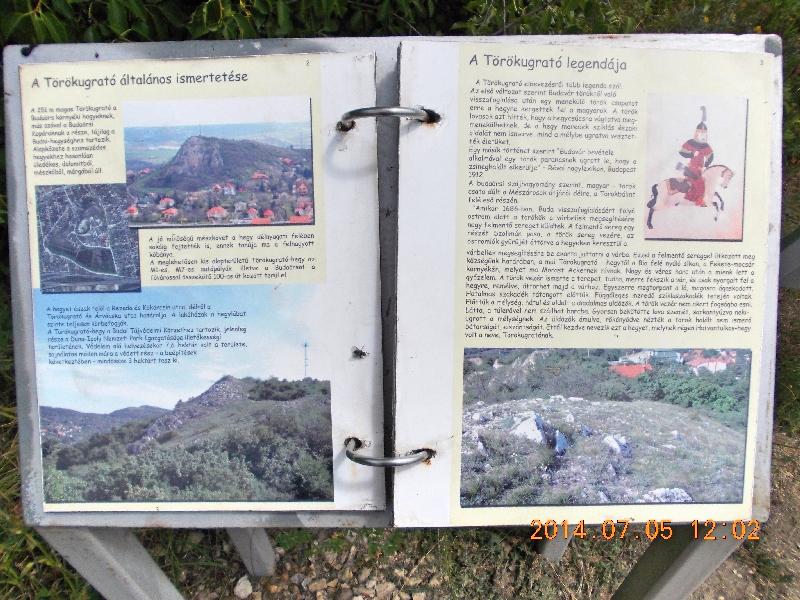 Rögtön az árulkodó nevű Törökugrató utca felé vesszük az irányt, mai első ládánk begyűjtéséhez. Az utca meredeken emelkedik, így aztán a déli melegben gyorsan lihegősre veszem a figurát. Az utca vége előtt balra fordulunk egy ösvényre és máris a természetben találjuk magunkat. Érdekesek ezek a “városi” hegyek! Egyszer még urbanizált környezetben ballagsz, majd hirtelen “erdőben”, de legalábbis fák és cserjék között vagy. Kis szigetek a város házainak tengerében. Azért a “civilizáció” közelsége megmutatkozik az idehordott és szétdobált szemét jelenlétén, már amennyire az ezt idehordó embereket civilizáltaknak lehet tekinteni. A kaptató tovább folytatódik és pillanatok alatt felérünk a csúcs alá. Mint kiderül a turistaút mellett egy botanikai tanösvényen is haladunk, mely a Naprózsa névre hallgat. A tanösvény állomásain egy-egy érdekes, lapozós könyv fogad bennünket, melyből megismerhetjük a hely növényvilágán kívül annak legendáját, geológiáját, talaját is.