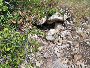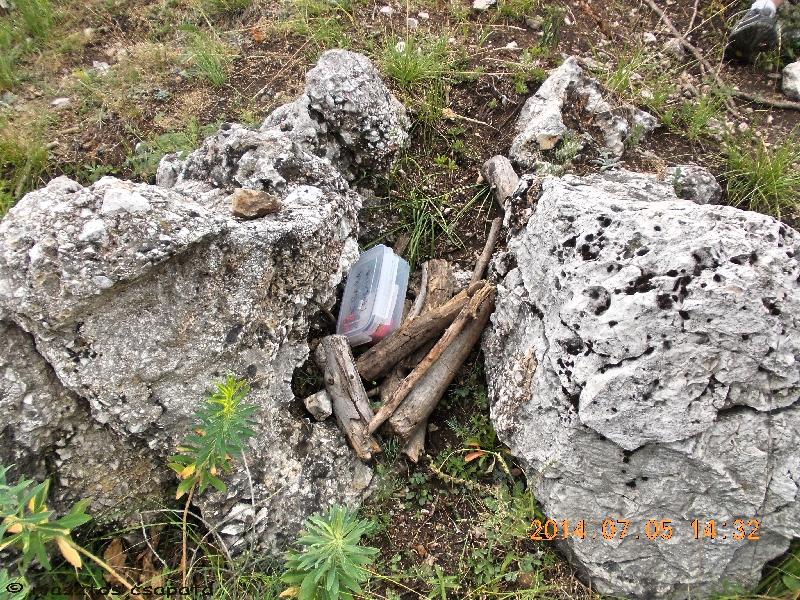 De a koordináták errébb mutatnak. Ez egy ún. bivakhely, ami afféle éjszakai pihenőhely a vándorok számára. Sajnos a ládát nem nagyon kell keresnünk, mert a leírással ellentétben, nem egy szikla alatt, hanem mindenféle álcázás nélkül, kicsit távolabb a rejtekhelytől, két szikla közzé, egy halom faág tetejére dobva találjuk.