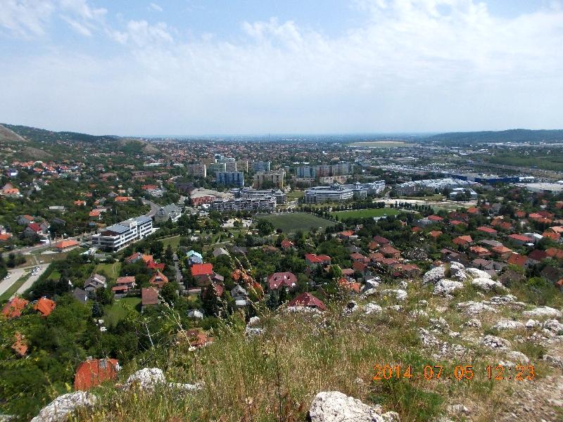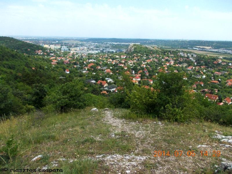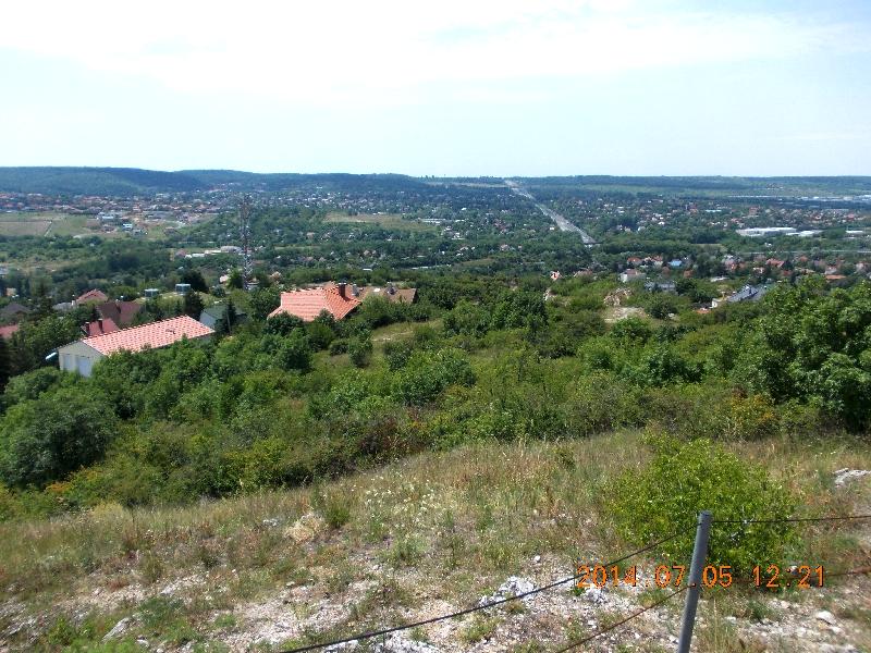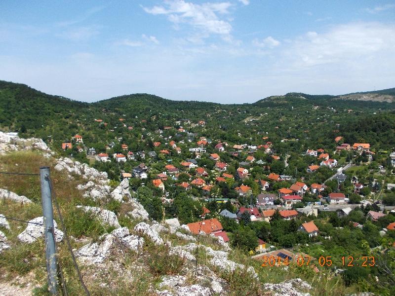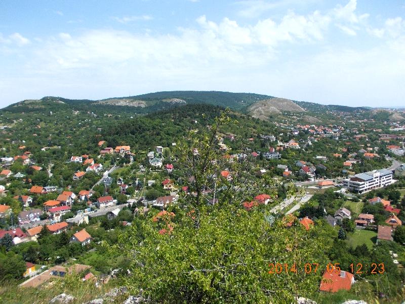 Lépteinket a szemben lévő Csík-hegy felé irányítjuk. Olyan ugrándozós ez a túra! Hol leugrunk, hol felugrunk egy hegyről/hegyre. Vagy, ahogy mi mondjuk, fagylaltozunk. (Magyarázatát lásd a korábbi bejegyzésekben!) Mondjuk egy igazi fagyi is jól esne ebben a melegben, de errefelé csak családi házak vannak. Majd azok is elmaradnak és újra erdőben vagyunk. Ideje is volt, mert erős sült szalonna illat kezdett körüllengeni, ha felhúztam a pólómat. Ismét csak kaptatón megyünk és rövidesen egy remek kilátóhelyhez érünk. Innen vethetünk egy pillantást legelső helyszínünkre a Törökugratóra és a környező tájra.