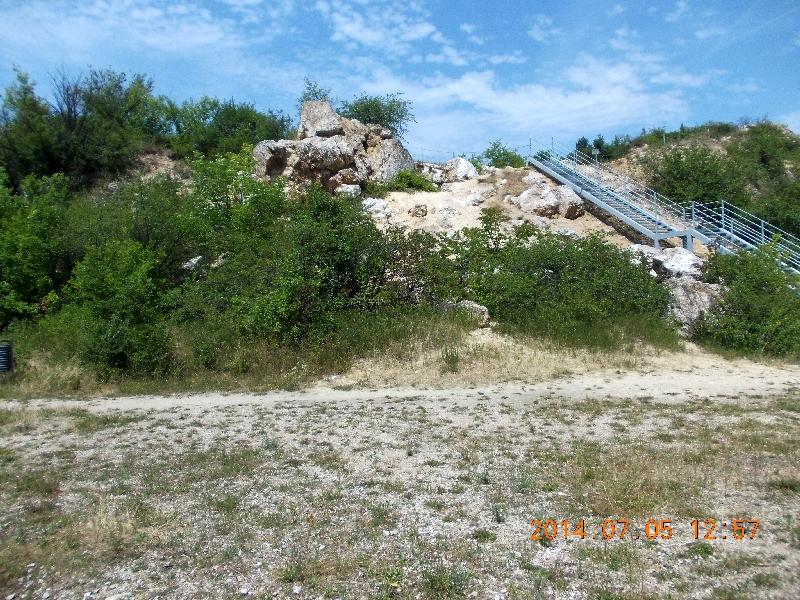 Mivel a “csúcson kell abbahagyni”, elindulunk lefelé. Itt a hagyományos ismertető táblák is megtalálhatók a tanösvény mentén. Fém lépcsősor vezet le az egykori dolomitbánya területére, melyet már próbál a természet visszahódítani. Elolvassuk a kihelyezett tájékoztatókat és iszunk egyet a területen található kút hűs vizéből, mert a mi készletünk már igencsak felmelegedett.