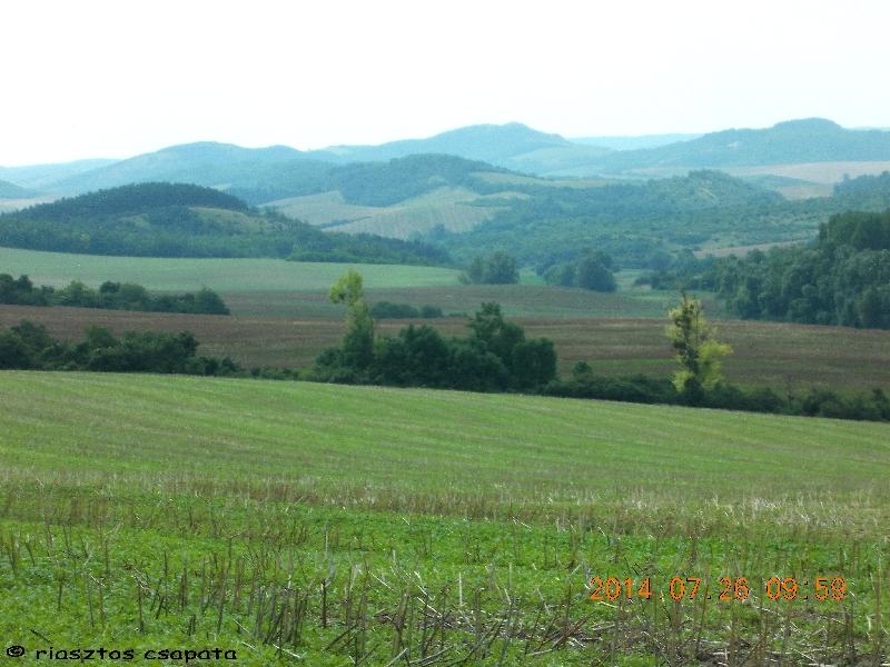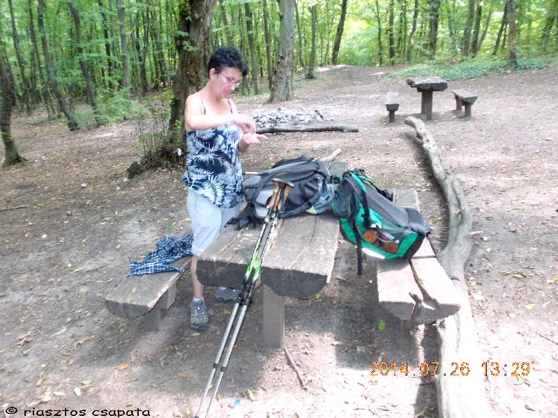 Most szembesülök vele, hogy amikor itt jártunk, akkor a ládázásunk első évfordulóját ünnepeltük. Micsoda véletlen! Na, kíváncsi vagyok jövő ilyenkor, hol kötünk ki!? Ritkábban, majd sűrűbben benőtt területen visz az utunk. Elérjük a “Nagy Kék Országutat” és a térképre nem is nézve, az emelkedő felé fordulunk. Pedig jó lett volna nézni, mert pár száz méter után rájövök, hogy rossz irányba megyünk. Most a lefelé vezető út lett volna a helyes. Megfordulunk. Piszkosul meleg van, még a fák között is. Egy üveg víz már el is fogyott! Szerencsére van bőven!