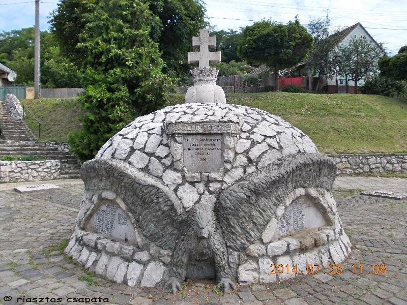 A temető mellett érünk be a településre. Találunk egy közkutat, amire nagy örömmel csapunk le. Vizünk ugyan van, de már lassan melegebb a pi..nél is, ezért élénken üdvözöljük a jó hideg vizet, ami a kútból folyik. Vé még mosakodni is kezd. “Ne fürgyé le!” – mondom neki, de hiába. Egyébként igaza van, remekül frissít a hideg víz. Talán egy egész percig is élvezzük a jótékony hatást, de még el sem indulunk már elpárolog forró bőrünkről és megint izzadunk. Beérünk Bajót központjába, ahol az I. és II. világháborús emlékmű áll. Körben a kövezetben a hét vezér neve egy-egy márványlapon.