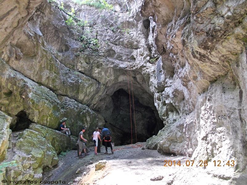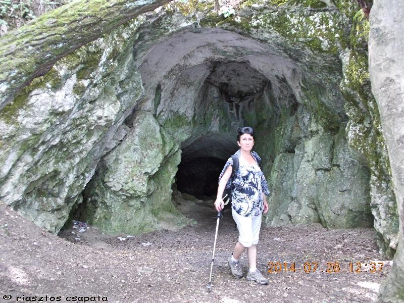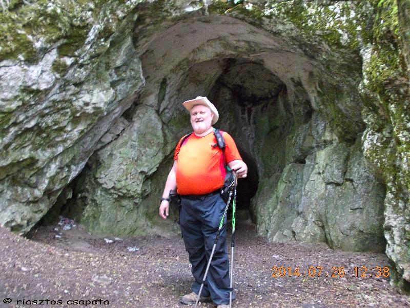 jelen indulunk az Öreg-kőhöz, más forrás szerint Öregkőhöz. A ládaoldal kellemes sétát ír, ami az út első felére igaz is. Kis kitérő után viszont a hegyoldal meredekre vált és a 30 fokos nyári hőségben, nekem bizony a Himaláját is meghazudtoló módon, ritka a levegő. A még meglevő négy üveg ásványvíz sem könnyíti meg a dolgom. Egyszer, a zihálásomon keresztül meghallom, hogy az ösvényen jönnek mögöttünk. Először két kutya tűnik fel, lógó nyelvvel (ezek csúfolnak engem!), majd egy szimpatikus fiatal hölgy, aki fut(!) felfelé ott, ahol én csak vonszolom magam. Micsoda emberek vannak! Félrehúzódunk, hogy elengedjük a “gyorsot” és közben torz vicsorgásom próbálom kedves mosolyra változtatni, nehogy a lány ijedtében rám küldje a kutyákat. Szép lenne, ha még azok elől is futni kellene! Lassanként, azért alattunk is vízszintesre vált az út. Hűvös sziklák alatt megyünk, igazi felüdülés. Ez már az Öreg-kő. A növényzettől ugyan nem sok látszik most belőle, de télen klassz lehet! Beérünk egy barlang előtt kiépített pihenőhelyre. Kicsit szusszanunk és tájékozódunk. Csinálunk néhány fényképet a barlang szádája előtt, miközben hátulról a “klíma berendezés” isteni hideg levegőt áraszt.