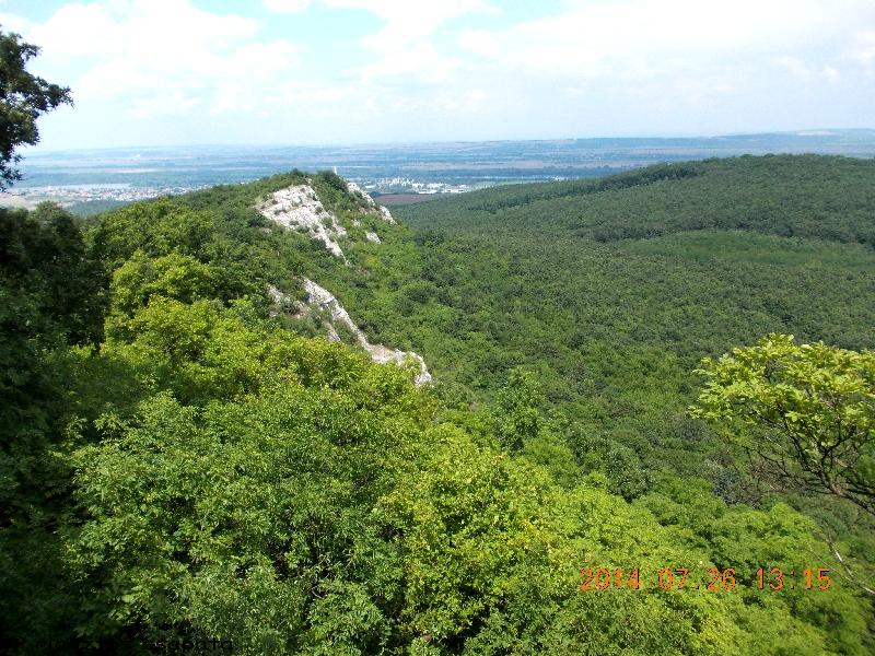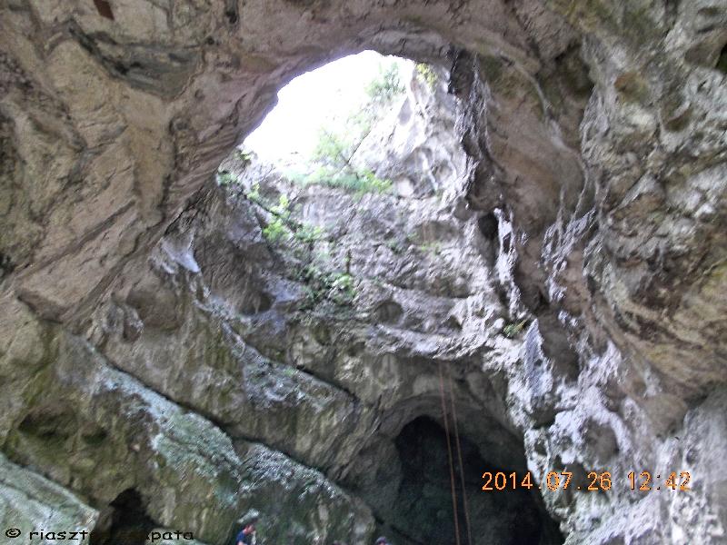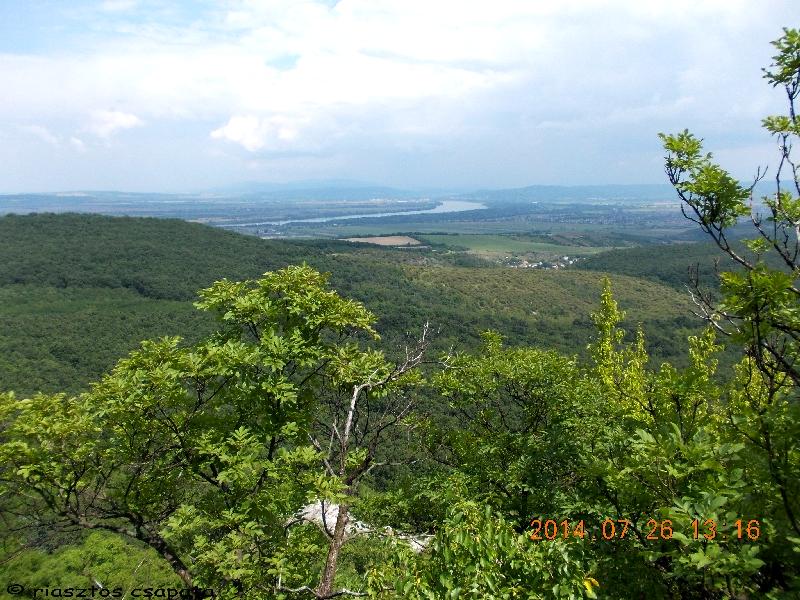 Beljebb éppen sziklamászók gyakorolnak. Nem akarunk zavarni, ezért a kiépített lépcsőn elindulunk a barlang fölé, hogy megkeressük a multi második pontját, a ládát. Aránylag gyorsan megtaláljuk. Egy borzalmasan ramaty állapotú zacskóba van csomagolva, amit kicserélünk. Bár nem szeretjük a zacskós rejtéseket, de ha a tulaj így szereti, legyen! Közben távoli moraj hallatszik többször is. Biztos valamelyik kőbányában robbantanak. Jövetben többet is láttunk – gondoljuk. Aztán beugrik, hogy szombat van, nem valószínű, hogy dolgoznának. A logolással végeztünk, így kimegyünk a közeli sziklaperemre, hogy megcsodáljuk a tájat. Mire kiérünk, már határozottan hallatszik, hogy nem robbantanak, hanem az ég zeng.