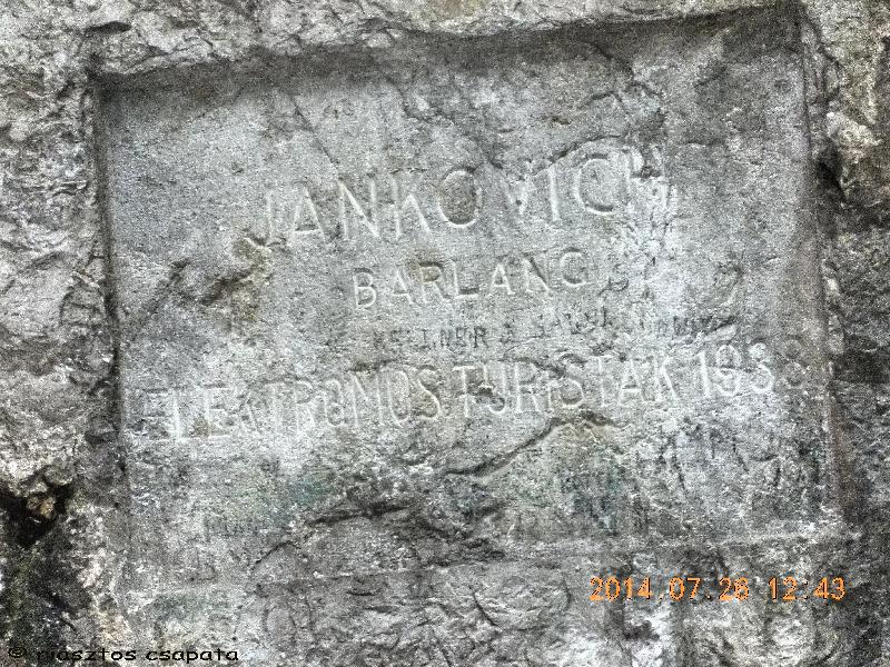 Én valahogy úgy érzem, hogy a lelkem elhagyni készül a testem az emelkedő után. A fényképen döbbentem látom, hogy ez így is van. A mellkasomon egy nagy folt látszik. Tényleg olyan, mintha a lélek szállna ki belőlem. Aztán rájövök, hogy a technikai póló UV-szűrő rétege ilyen érdekesen mutat napsütésben. De ez csak a fényképeken látszik. Miután újra kapok levegőt és rájövök, hogy a lelkem még velem marad egy kicsit, elindulunk felfedezni a barlangot. Találunk is egy megkopott táblát, miszerint a Jankovich-barlangban járunk.