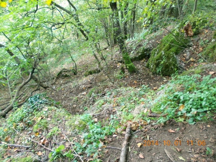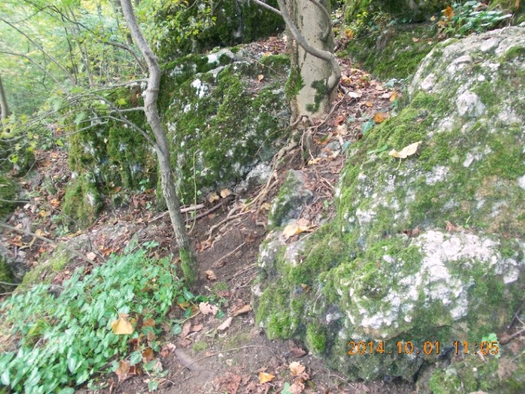 A korábbi logokból annyit kihámoztam, hogy a geoláda valahol egy szikla alatt található, de nem könnyű rátalálni, mert nem túl jó a GPS vétel a helyszínen. Én is hasonlóképpen járok. A GPS hol 1 m-t, hol 10 m-t jelez változó irányban, pedig én csak néhány lépést teszek előre. Olyan a szemem, mint a jó postásnak, egyik a GPS képernyőn, míg a másikkal a terepet kutatom. Közben zergéket megszégyenítő módon ugrálok szikláról sziklára, mert a terep ugyancsak változatos és meredek. Néha jól beverem a sípcsontom, hiszen harmadik szemem nincs, hogy még azt is szemmel tartsam, hogy hová lépek.