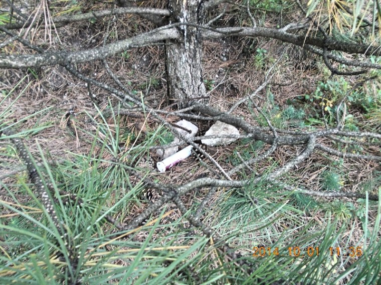 A láda csak pár méterre van a turistaúttól, ahogy a leírásban írva vagyon: “Avtzsaka arágá őyn efyge ersépél ráp lóttút tezleja.” Ez nem élienül van írva, csak visszafelé kell olvasni! Tehát egy fenyő ágán kell keresni. Bár az utolsó logok alapján, inkább alatta. A dilemma hamar megoldódik, mert a koordinátára érve, egy csenevész fenyőcske alatt ott hever rejtetlenül, az álcázásra szolgáló kövekre dobva, a geoládaként tovább szolgáló pezsgőtablettás doboz.