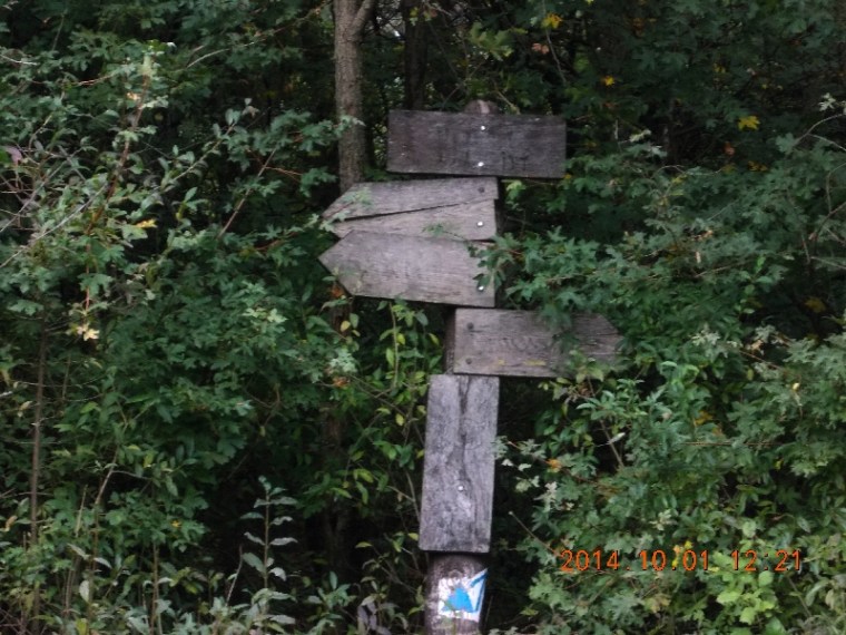 Az elágazásban két útjelző táblát találok, egy régit is egy újat. Elnézegetve ezeket, be kell látnom, hogy azért vannak pozitív fejlemények is, hiszen a régi tábla olvashatatlanná kopott, az új meg nagyszerűen olvasható.