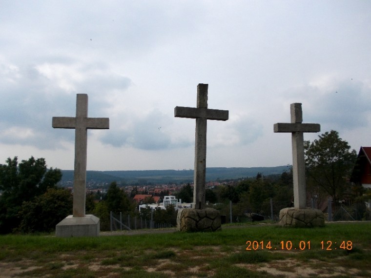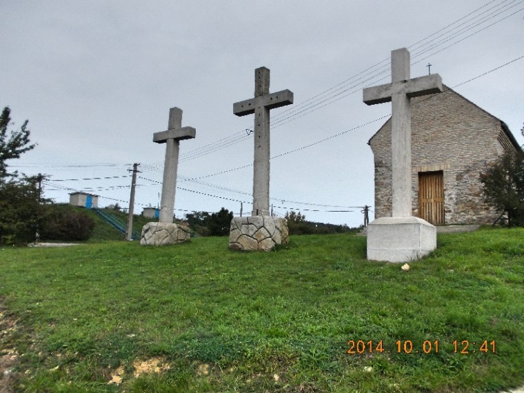 Lassanként tovább indulok a Nagykovácsi Kálvária, következő úti célom felé. Itt Nagykovácsira történő kilátással kecsegtet a láda neve. Lássuk! Nem sokat kell mennem és már a település házai között járok. Szinte egyenes út vezet a Kálváriához. A leírás szerint az egykori három keresztből már csak kettő áll. Odaérve, én három keresztet és a tetőtlen romkápolna helyett, egy felújított épületet találok. Ráférne a ládaoldalra egy kis ráncfelvarrás. Mint az a táblákról kiderül, 5 éve adták át a felújított harmadik keresztet, ami láthatóan másképp is néz ki. Azóta tető is került a felújított kápolnára.