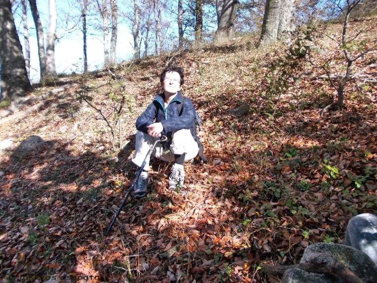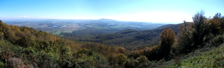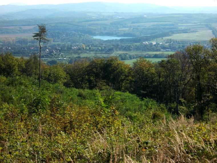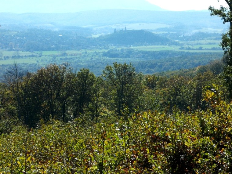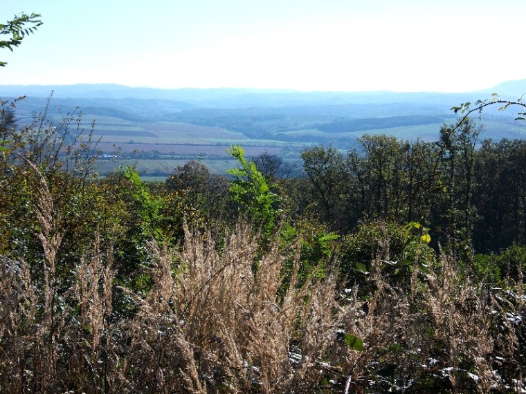 Szerencsére a nap hétágra süt, így már felszívta a reggeli párát, jó kilátásra számíthatunk. Elindulunk és pár száz méter után, egy srégen jobbra, felfelé induló jelzetlen úton megkezdjük a kapaszkodást a bércre. Még egy kilométert sem kell menni és egy félkör leírása után, már fent is vagyunk. A kilátás hasonló ahhoz, amit korábban lentebbről láttunk, de most magasabban vagyunk. A látvány magával ragadó, így le is ülünk kicsit csodálni a táj szépségét. Zoli közben a szedresben tallóz, talál is néhány elkésett gyümölcsöt. Egy hónapja még, akár jól is lakhattunk volna belőle!