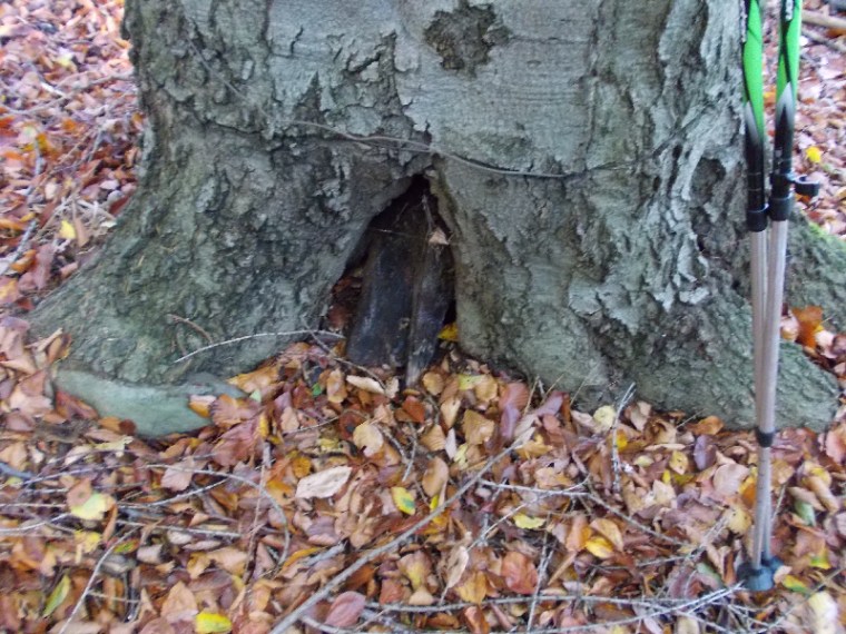 A láda közelébe érve, mint a vadászkutya, ha szagot fog, szinte rohanunk a láda felé. Nehogy valaki megelőzzön! A kopjafához érve, kezdődik a keresés. A koordináta nem sok támpontot nyújt, mert a még sűrű lombozat alatt, a GPS vétel nem túl jó. 10m feletti pontosságot mutat a műszer. Egyébként is, megfigyeléseim szerint, a bükkfák jelentősen rontják a GPS vételt. Semmilyen más fafajta környékén nincs olyan rossz vétel, mint a bükkösben. Itt pedig akad bükk bőven. A szemünkre hagyatkozunk. Zoli és Vé laza csatárláncban keresik a ládát.