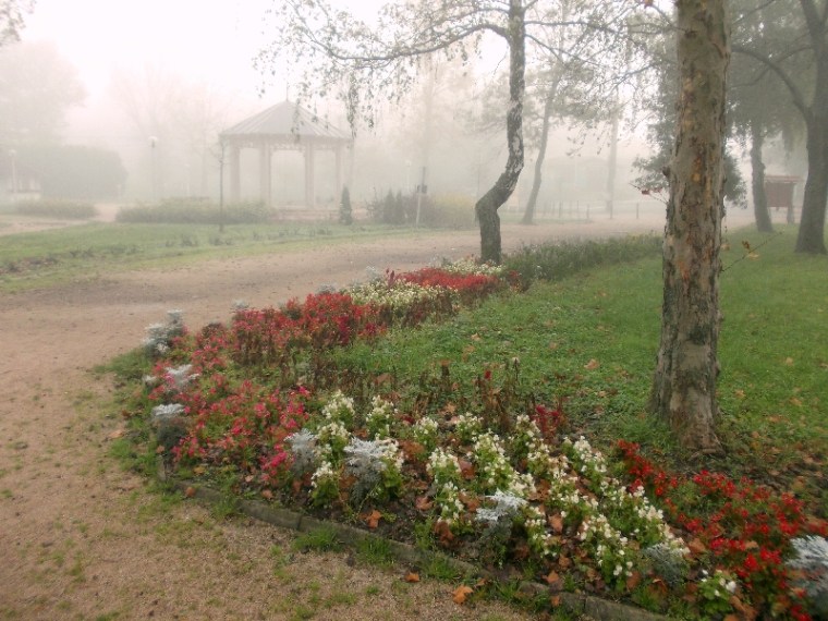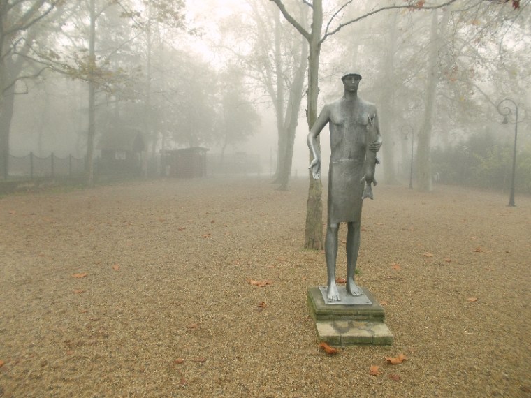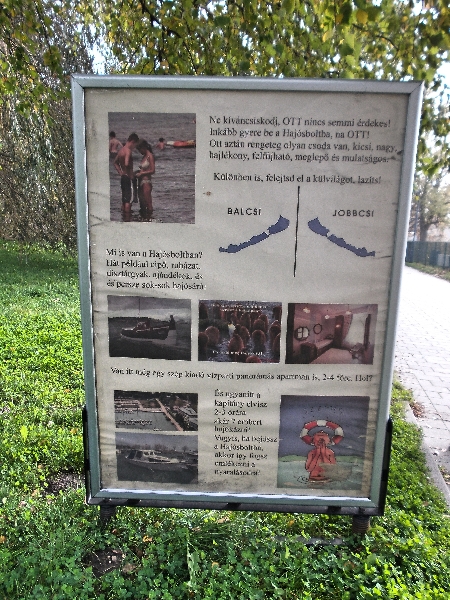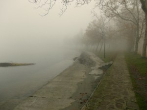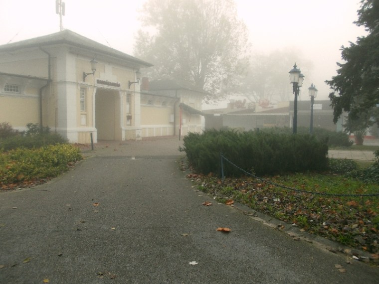 Elindulunk a parti, gesztenyefákkal övezett sétányon, ami egyébként nagyon szép. Már persze akkor, ha nincs ekkora köd. Fel is idézzük régi emlékeinket azokból az időkből, amikor még külön-külön jártunk erre. Közben el is érjük a multi első pontját. Innen visszapillantunk, de a Hajóállomás épülete már el is tűnt, pedig nem is szürke szamár.