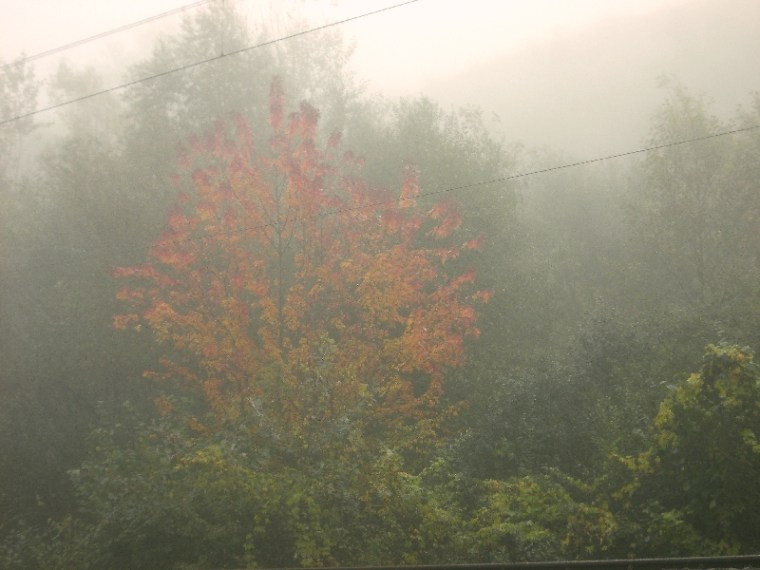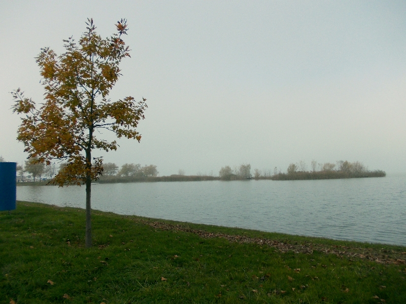 Haladtunkban mindenütt kacsák és hattyúk ( és nem hat tyúk) úszkálnak. Időnként csattogás hallatszik a víz felől, ahogy szárnyra kelnek, de inkább csak sejtjük, mint látjuk. Miután végig értünk a Kvassay-sétányon, a legvégén beljebb megyünk a település belseje felé és a párhuzamos utcán folytatjuk utunkat. Itt található a kerékpárút is és az út túloldalán, a vasúti töltés is. Az egyik helyen, a vasúton túl, megpillantunk egy szép vörös-sárgába borult fát, mely kirí a környezetéből. Kicsit közelebb megyünk, hogy a ködön kívül látszódjon valami a fényképen, de így is gyengécske fotó sikeredik, a köd csak nem akar ritkulni.