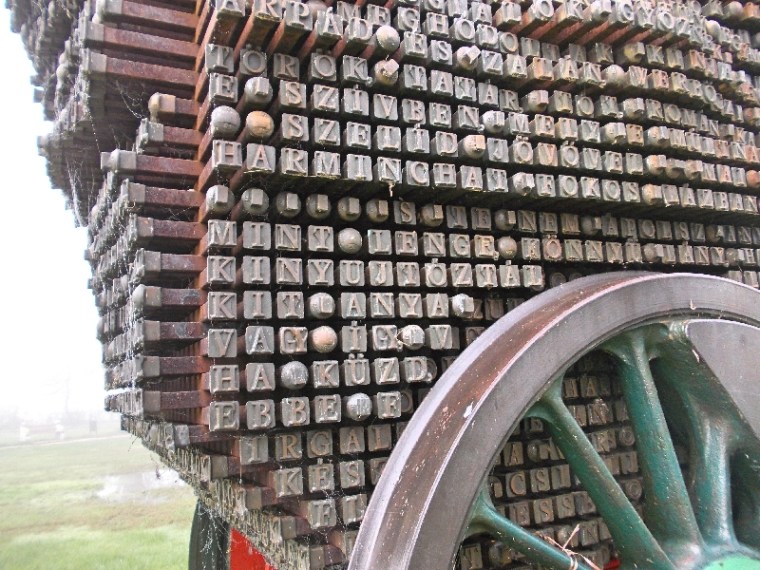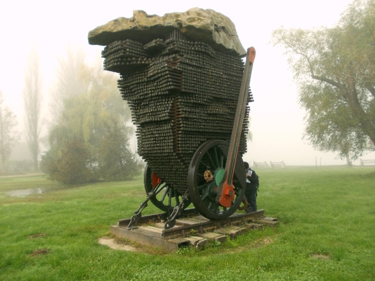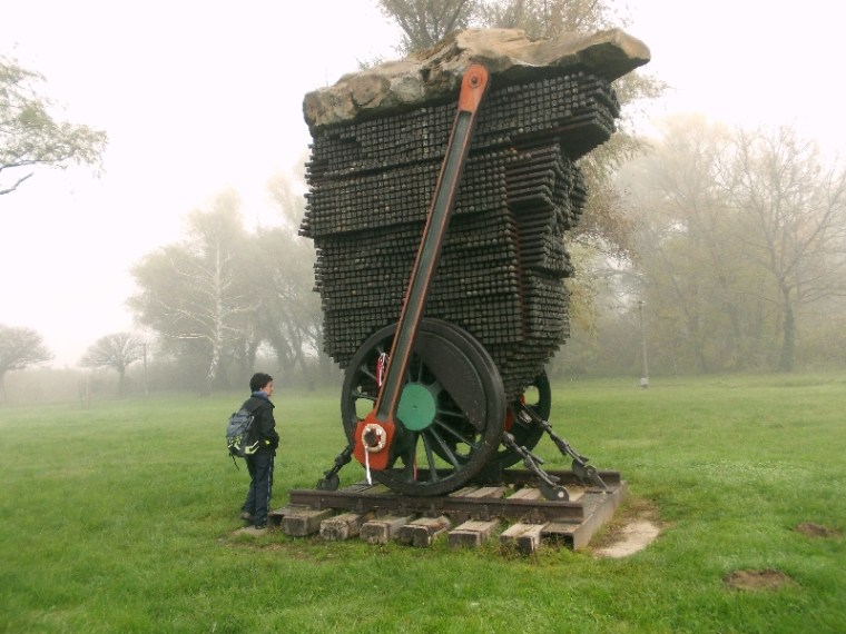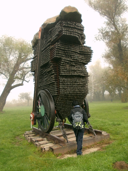 Stílszerűen vasúti alkatrészekből áll. Van itt egy gőzös kerékpárja a hajtókarokkal, egy vágánymező darab, csavarkapocs a rögzítéshez és rengeteg sínszeg és síncsavar, melyekre betűkkel ellátott kupakokat húztak. A betűkből József Attila verssorait lehet kisilabizálni. Sajátos ez a mű, jól kifejezi József Attila életét és sorsát. Nekünk tetszik. A találat után kicsit nézelődünk még a parton, de indulunk is tovább, mert a cipőink kezdenek kihűlni ácsorgás közben.