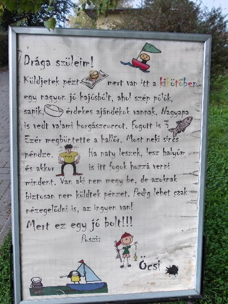 Kikerüljük a központi strandot, majd ismét közelebb húzódunk a vízhez, de nem sokat látunk belőle, mert a vízpartra egy utcasor épült és azok hátsó kertjei érnek le a vízhez. Később kerítés állja utunkat, egy Üdülőpark, így ismét eltávolodunk a parttól. Annyira, hogy még a vasutat is kereszteznünk kell. Kimegyünk egészen a 7-es számú főút mellé. Szerencsére a forgalom nem zavaró ezen a novemberi, hétvégi napon. Közben észrevétlenül átértünk Szemesre. A kerékpárúton megyünk, de kerékpárossal nem találkozunk. Ahogy lehet, azért közelebb megyünk a parthoz, egy párhuzamos utcába. Itt tényleg semmilyen gépkocsi forgalom nincs, csak a téli Balaton nyugalma és az alvó üdülőépületek sora. Később ismét sikerül egy szabadstrand szélén a víz közelébe kerülni, majd a Hattyú Kemping mellett-mögött kijutunk a mólóra. Itt már sokan sétálnak és a napocska is erőlködik, hogy áttörje a ködöt. Jót nevetünk egy Horgászbolt megállító tábláin. Jó fej lehet a tulaj, ha ilyen egyedi táblákat állított!