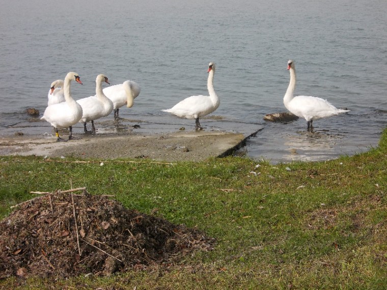 Mi nem pecázunk, így nem engedünk az invitálásnak, megyünk tovább. A víz mellé érve aztán győz a napsütés és bevilágítja a tájat. Most már jól látszanak a szárítkozó hattyúk. Ezek éppen hatan vannak, mégsem hat tyúk. ![]()
