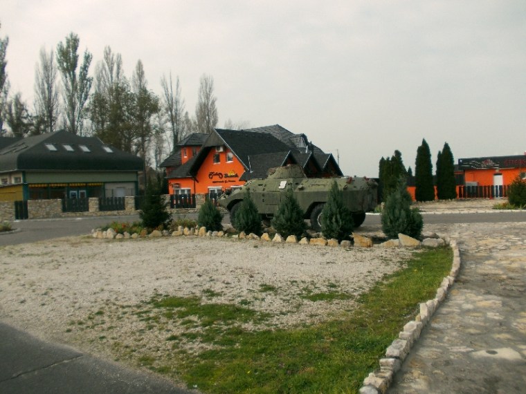 Később ismét száműzetünk a víz mellől a vasút mellé. Ismét egy Kemping állja utunk. Felismerem benne azt a helyet, ahol 14 vagy 15 éves koromban 1 hetet töltöttem el táborban. Érdekes, már akkor sem tetszett a nyári Balaton! Viszont a kerítés melletti bokrok szépek, főleg így a derengő napfényben. Egy vendéglátó egység előtt obsitos katonai járművek találhatók. Vajon, milyen indíttatásból kerültek ide? Valószínűleg a tulaj is egy obsitos katona lehet.