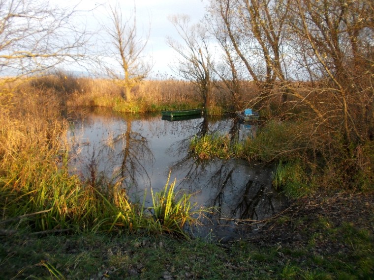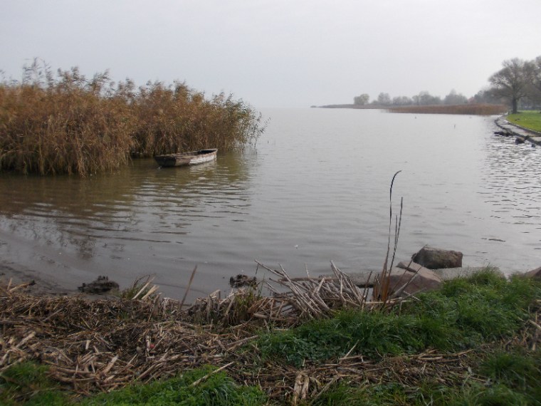 A lefelé vezető aszfaltúton megyünk. A nádasban van egy ösvény, azon elindulunk. De egyre sárosabb, cuppogósabb a terep. Kb. 50 m után belátjuk, hogy ide nem elég a túracipő. Ide gumicsizma vagy mellig érő halásznadrág kell! Visszafordulunk és némi reménnyel nézegetjük a híd alá kikötött horgászcsónakokat. Ha lenne evező valamelyikben, a folyón is ki lehetne evezni a torkolatba. De sehol sincs evező! Különben is, amilyen rendesek vagyunk, úgysem vetemednénk ilyen jogosulatlan használatra. De, jó eljátszani a gondolattal!