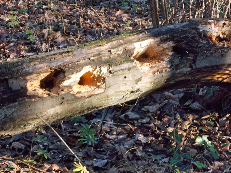-ra váltunk és viszonylag eseménytelen úton és ingerszegény környezetben érünk vissza Sopronba. Útközben látunk egy kidőlt fát, amibe a harkályok valóságos tölcséreket faragtak. Tetszik.