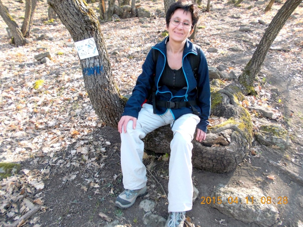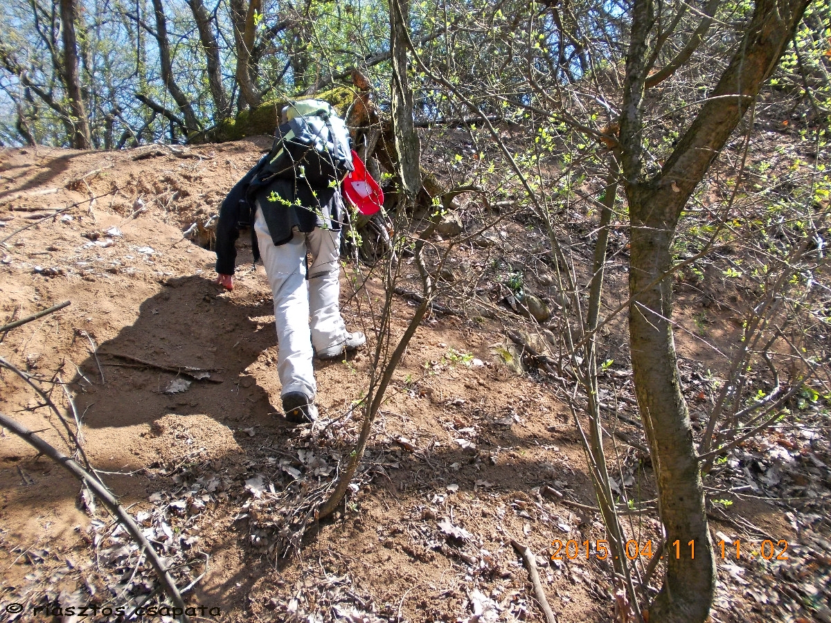 Fotózás után folytatjuk utunkat az egyre meredekebb hegyoldalban. Gyakran megállunk pihenni, mert nekem a tüdőm, Vé-nek a lába parancsolja így. Egyre többet kérdezgetem magamtól, ki volt az a hülye, aki kitalálta, hogy erre jöjjünk? A bűnös azonban lapítva hallgat(ok). (Utólag lejátszva a tracket, még 20 szoros gyorsításban is csiga lassan vánszorogtunk felfelé.) A 363 m szintkülönbséget 1 óra 40 perc alatt sikerült leküzdeni. Tehát nem mondhatnám, hogy ezen a kb, 1,8 km távon a menetszéltől lobogott volna a hajunk. Nem tudom a csiga mennyit fut két vödör vízzel 100 méteren, hegynek fölfelé, de az 1,1 km/h átlag sebességünktől nem sokkal maradhat le. Így kell nekünk alföldi, eltespedt irodakukacoknak! Vé útközben talált egy remek széket magának, alig tudtam továbbhaladásra bírni.