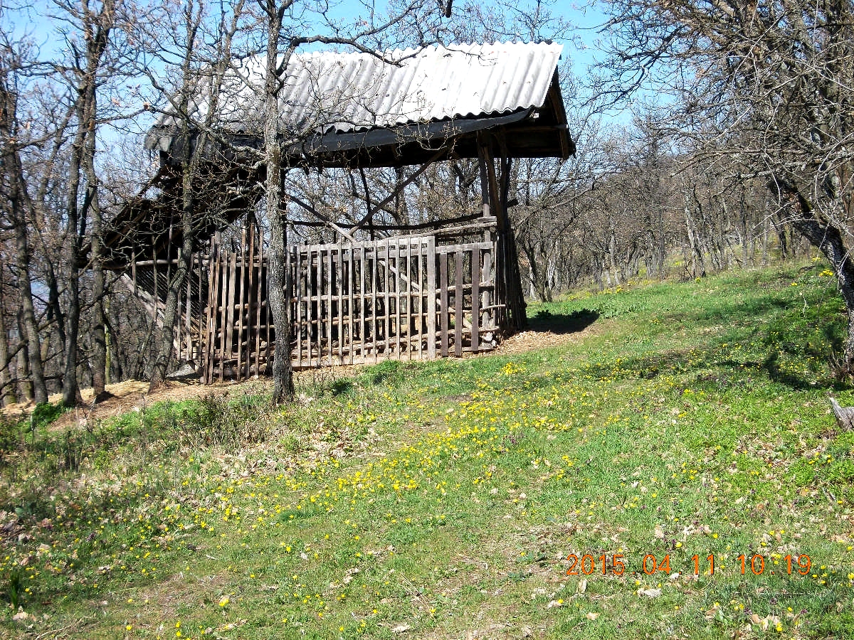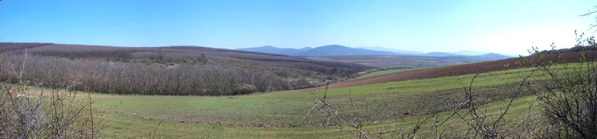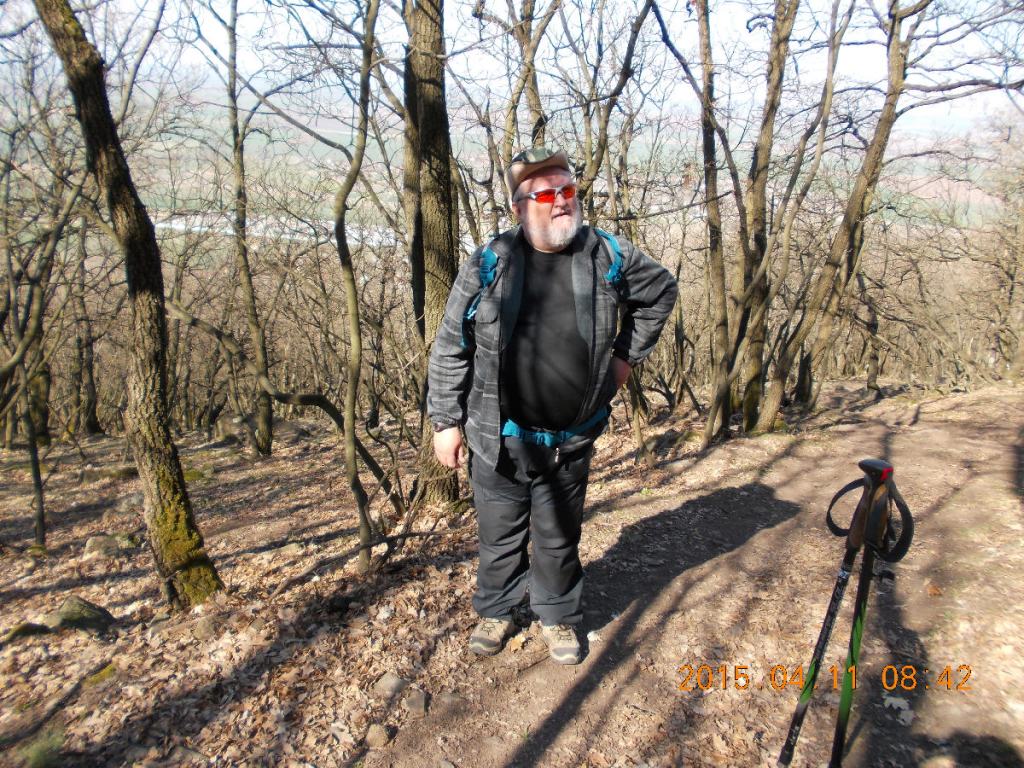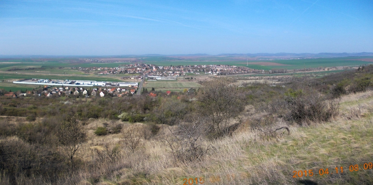 Szóval, a vonat elhaladása után, a sorompó felemelkedését követően, megindulunk a torony felé. Egyébként nem csak a helye ilyen cifra, a rendeltetése is. Ugyanis azon kívül, hogy geodéziai mérőtorony, még rádióamatőr antennatoronyként is funkcionál. Egy átjátszó állomás van benne. Erről később még ejtek néhány szót. Nem sokat megyünk, máris érezzük, hogy ma nem fogunk fázni. A reggeli hűvösben történő indulás miatt akad néhány réteg ruha rajtunk, melyből a legfelső gyorsan a hátizsákba kerül. Cipelhetjük egész úton, de reggel még szükség volt rá. A tavaszi nap zavartalanul süt le ránk. Pár száz méter után elérjük a falu szélét, ahol az aszfaltút ösvényre vált és irány a hegy. Szó szerint toronyiránt megyünk. Eleinte még elfogadható emelkedéssel. Mielőtt bevennénk magunkat a bozótosba, megállok szuszogni, miközben panorámaképet is sikerül készíteni a lábunk alatt és a távolban elterülő tájról.