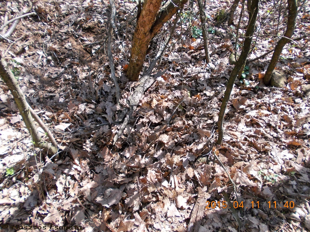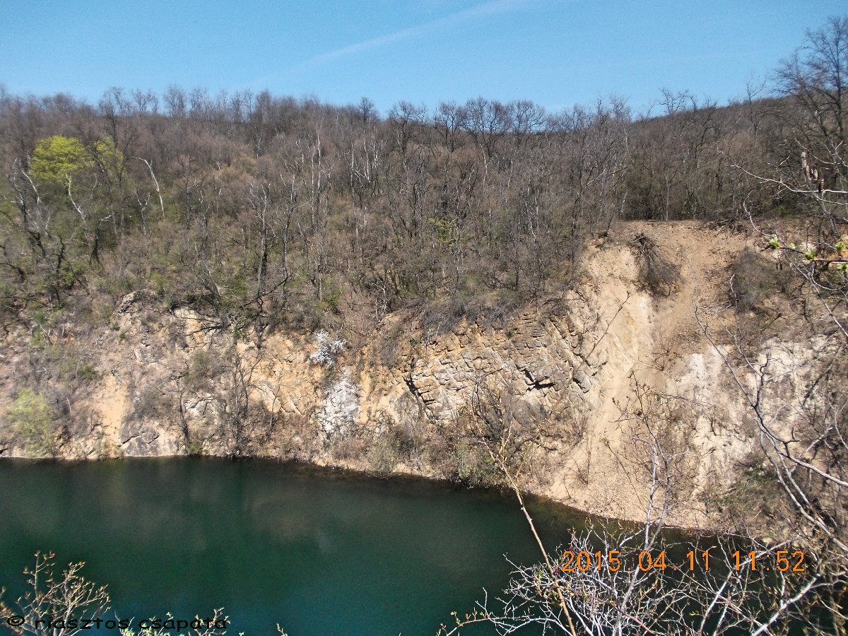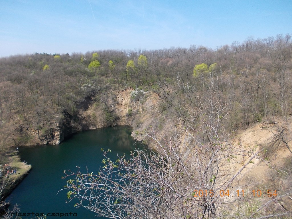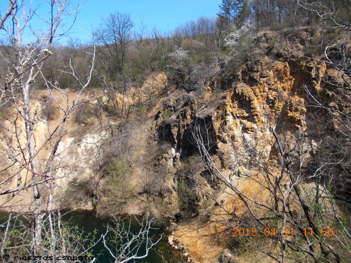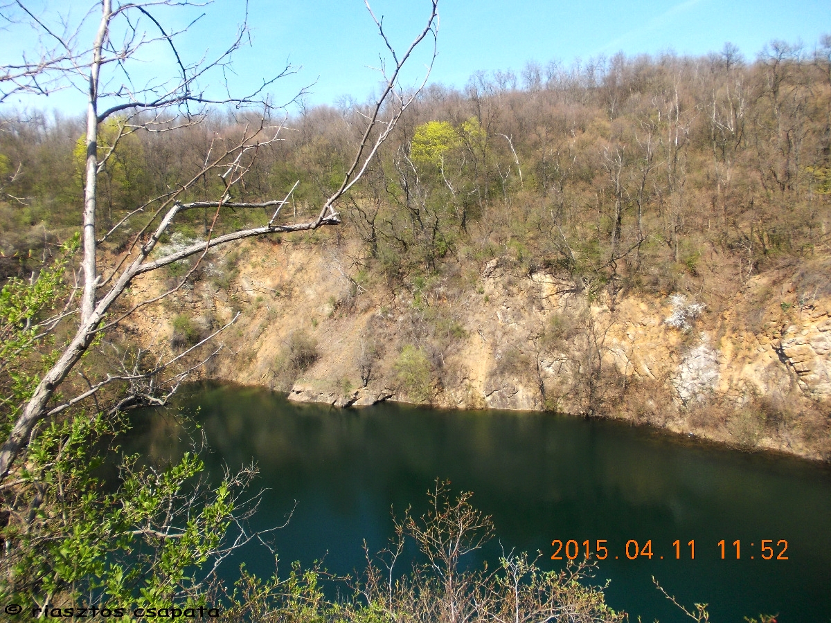 A kéklő vize partján, a virágba borult bokrokkal és zöld levélrügyeiket bontogató fákkal, lenyűgöző látvány. Percekig gyönyörködünk benne. Miután felocsúdunk, a láda után nézünk. Meredek partoldal van előttünk, valahol lejjebb mutatja a helyét a GPS. Arrébb megyünk, hátha vezet út lefelé, de nem. Nincs mese a meredek partoldalban kell leereszkedni. Szerencsére csak kb. 5-6 m a szintkülönbség. Lecsúszdázunk. Keressük a ládát. Egy fa tövében megtaláljuk, elég gyenge takarásban. Kinyitjuk, benne rengeteg papírlap a kesserek logjaival. Logfüzet, jelszó sehol. Ezt így nem tudjuk logolni! Felhívom a rejtőt és felajánlom neki a láda gyógyítást. Nagyon megörül neki, készségesen elárulja a jelszót, mi pedig egy új logfüzetet helyezünk el a ládában és még a doboz tetejének belsejébe is felírjuk alkoholos filccel a jelszót. Sajnos pót-íróeszköz nincs nálunk, így azt nem tudunk a ládában hagyni. Természetesen mi is belogolunk, majd igyekszünk alaposan álcázva visszarejteni a dobozt. A tavalyi avar segítségével ez elég jól sikerül. Következik a mászás, hogy visszajussunk az útra, mert felfelé vezető utat lentről sem lelünk. Vé lábának sorsa ezzel megpecsételődött. Már azt sem vállalja, hogy lemenjünk a vízpartra.