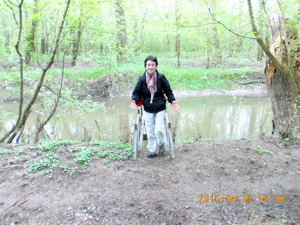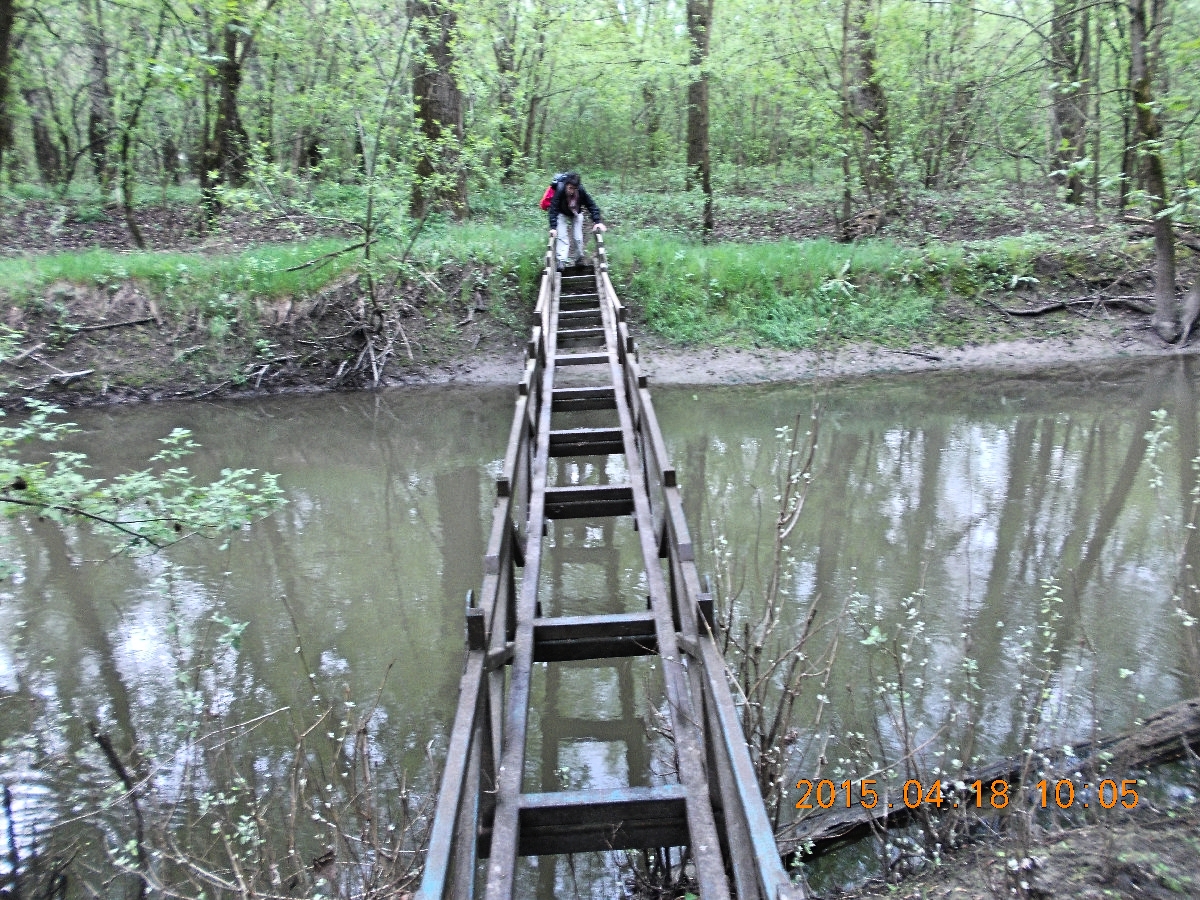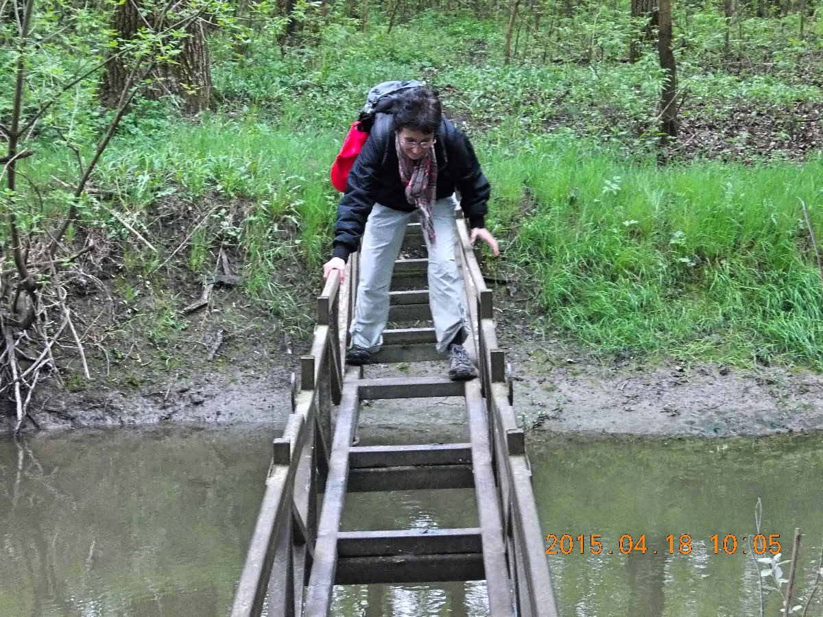 Szomorúan megyünk tovább. Idáig a folyó jobb partján mentünk, a láda azonban a túlparton van. Át kellene kelnünk! A térképen van is egy híd jelölve. Odaérve kiderül, hogy a híd kifejezés csak a híd vázát jelöli. A pallók hiányoznak. Mindenképpen át kell mennünk, mert az erdei út elkanyarodik tervezett útvonalunktól és persze a ládától, amiért is erre jöttünk. Vét elkapja a majré. Ő ugyan át nem kel! Akkor itt maradsz és megesz a jászberényi medve – mondom neki. (Nem tudom az Állatkertben van-e medve Jászberényben, de Vé sem tudja, így rá lehet ijeszteni. )Én már látom az átkelés módját. Az alig méternyi széles kis híd oldalsó gerendáin lépkedve, nagy terpeszben át lehet jutni. A karfák épek, lehet kapaszkodni. Át is megyek, megmutatva a módszert. Vé még szabódik egy kicsit, de aztán nincs mese, nekivág. Én pedig fotózom a nagy átkelést. Vé-nek ez a teljesítménye felér az egykor, a Bering-szoroson átkelő népekével, pedig ott még hajó is volt! A végén aztán olyasféle mozdulatot tesz, hogy “Na, mit kellett úgy be.. (ijedni), semmiség az egész!”