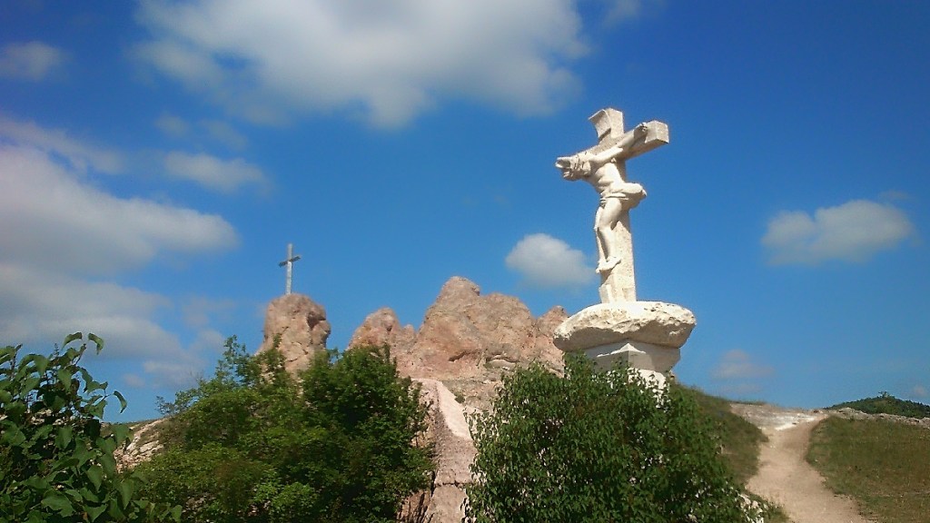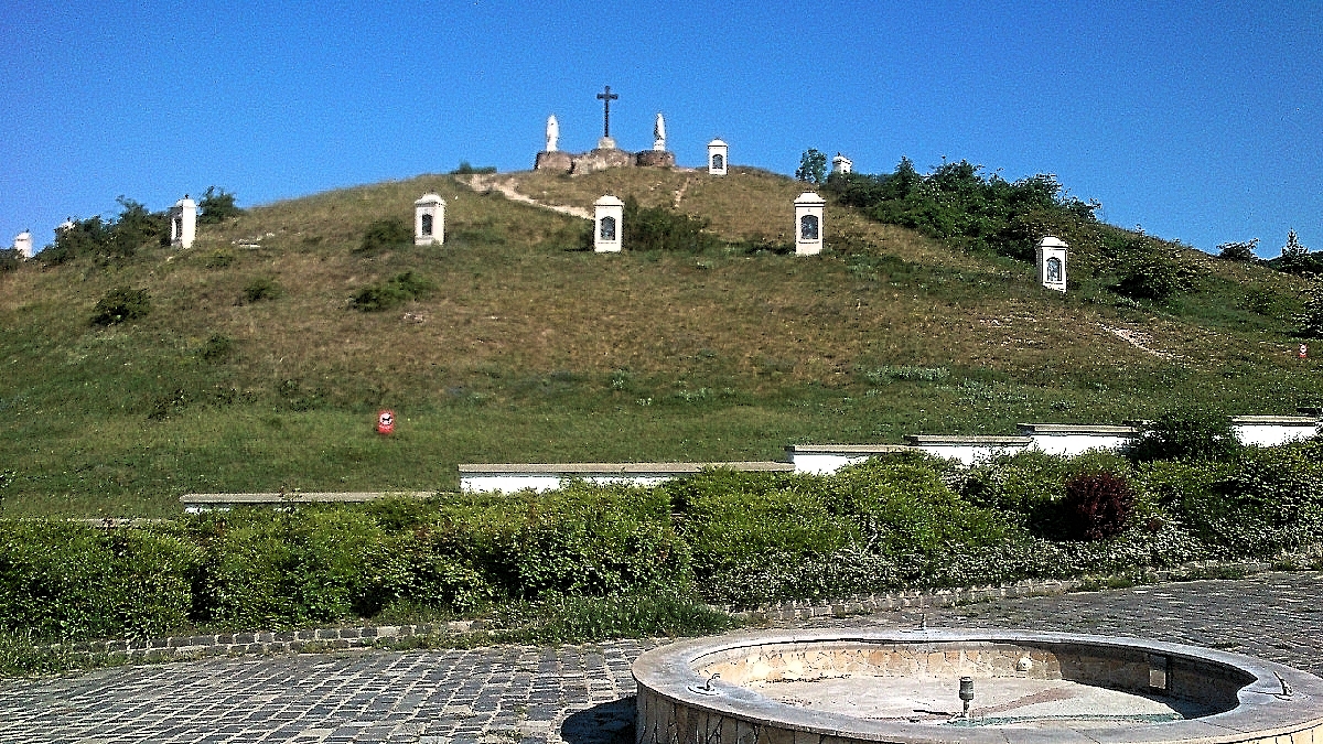 Sajnos, most is csak a régi, gyengécske minőségű képeket készítő mobiltelefon áll rendelkezésre. A kápolna megtekintése után, nekivágunk a dombnak. Csigavonalban csavarodik az út felfelé. Sorban megtekintjük a sorakozó stációkat. Igazán szépek, láttunk már sokkal csúnyábbakat is! Nekünk a kakukktojást kellene megtalálni közöttük. Alaposabban megnézve, fel is fedezünk egy kis különbséget az egyiknél. Nem is feltűnő, csak ha alaposan szemügyre veszi az ember. Odamegyünk és kezdődik a kutatás a jelszót tartalmazó kis táblácska után. Kis idő múlva megtaláljuk, majd logolunk. Még vetünk néhány pillantást a környező tájra. Nem vagyunk nagyon magasan, de már innen is szépen kitárul a panoráma. “Lecsavarodunk” a dombról az út spirálján és indulunk a következő láda felé, ami a távolban már látszik is.