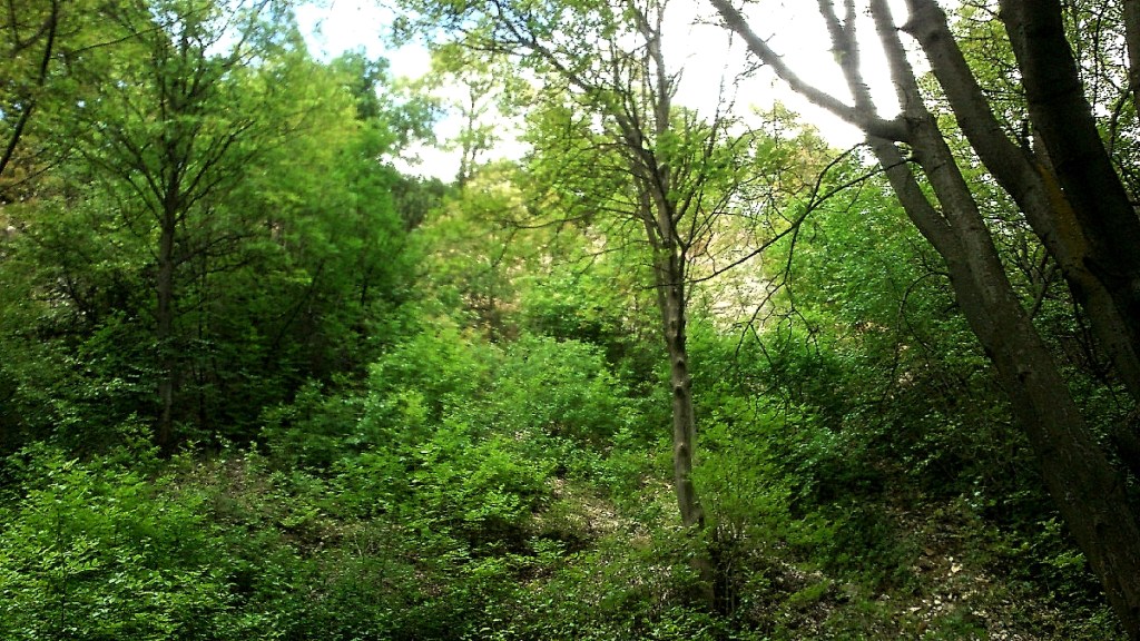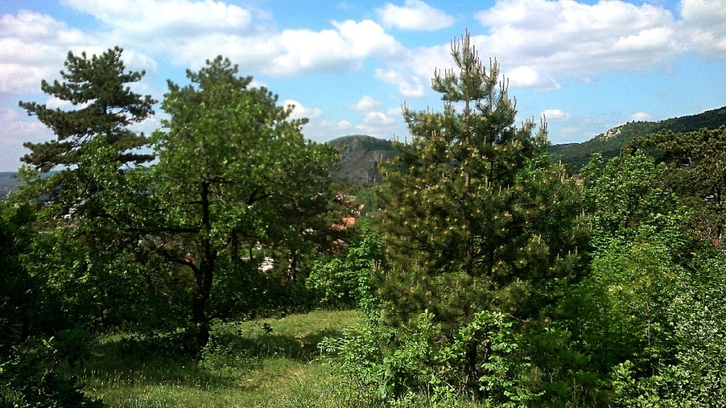 A következő ládáig már hosszabb sétát kell tennünk. A Naphegyig meg sem állunk! A Kőhegyről rövid időre visszatérünk a házak közé, majd átvágunk az Új Temetőn. Ennek sarkán kezdődik a Nap-hegyi-árok. Mi azonban tovább megyünk pár utcával és csak onnan kezdjük támadni a hegyet. Eleinte szelíden emelkedik az út, azonban az erdő szélét elérve, egészen meredekre vált. Komoly kaptató van előttünk. Képzeletbeli sebességváltónkon egészen egyesbe kell visszaváltanunk, hogy aztán “padlóig taposva a gázt”, feljussunk a tetejére. Komoly lihegésbe fogok, mire felérünk, de Vé is szaporábban szedi a levegőt. Vegyes fás terület van körülöttünk. A lombhullató fajok már átvették az uralmat az egykori fekete-fenyőkből álló erdő felett. A tanösvény táblája szerint karsztbokorerdő vesz körül bennünket. Még egy kis mászás és előttünk magaslik a ládát rejtő szikla, melynek földalatti üregében lapul a minket érdeklő kincs. Hétfő ellenére meglehetősen sokan császkálnak erre, ezért Vé felül a szikla fölé, hogy jobban lássa a jövő-menőket, mint a szurikáták, én pedig benyúlok a ládáért.