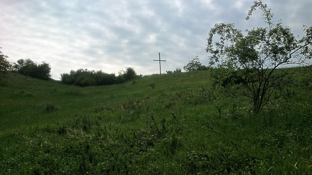 Elhagyjuk a házakat és már fák között megyünk tovább. Az út ismét emelkedik, de nem vészesen. Felérünk egy kápolnához, amely előtt a Trianoni emlékmű keresztje áll.