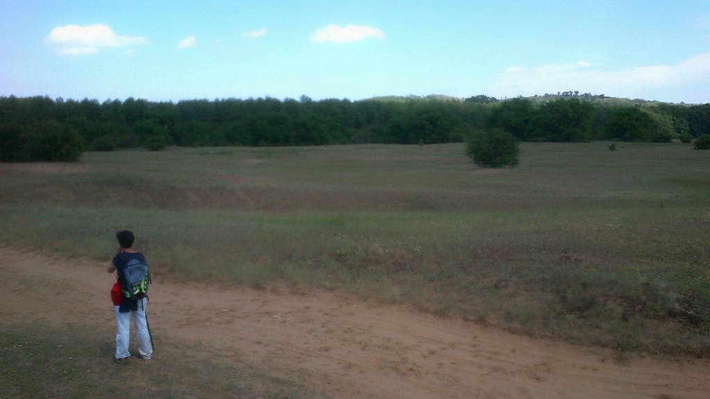 Nemsokára elfogy az erdő és cserjésekkel borított területen haladunk, ami azért jó, mert láthatóvá válnak a környező dombok szelíd vonulatai. Mellettünk villanypásztor húzódik, rábírva minden erre járót, hogy a járt utat a járatlanért el ne hagyja.