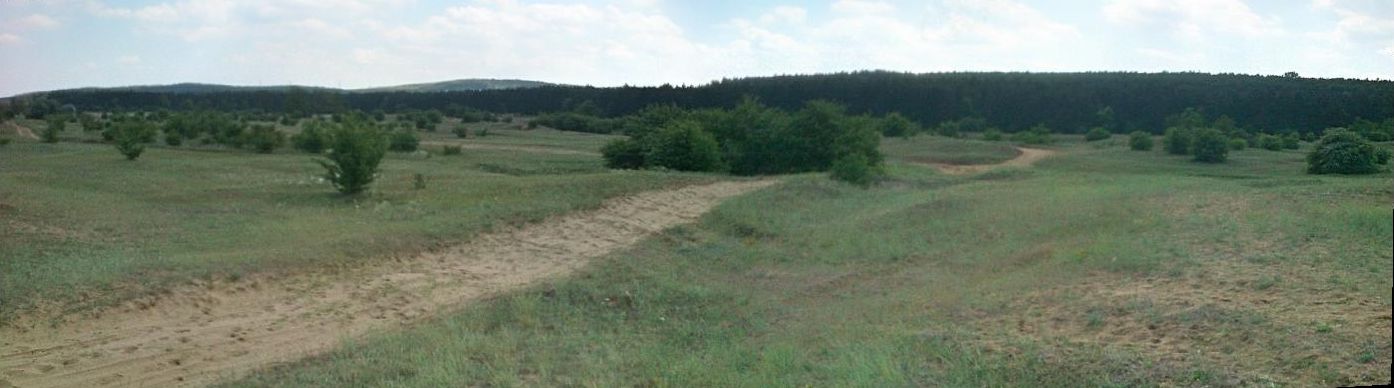 A cserjést tűlevelű erdő követi. Itt már homokkal kevert a talaj. Érdekes, hogy mégis elél rajta a fenyő! Bár nem olyan szépek, mint az Alpokalján, de azért még erdőt alkotnak. Megyünk a nyílegyenes úton, majd némi törésekkel 90 fokot fordulunk balra, aztán jobbra. Itt el is hagyjuk a jelzett utat, hogy a számtalan szekérút jellegű csapások egyikét kövessük, ugyanis megérkeztünk a tiszta homokra. Váltakozva fenyők és lombhullató fajok (zömében akác) mellett, időnként között megyünk és derékszögű kanyarok után el is érjük a homokgyepet.