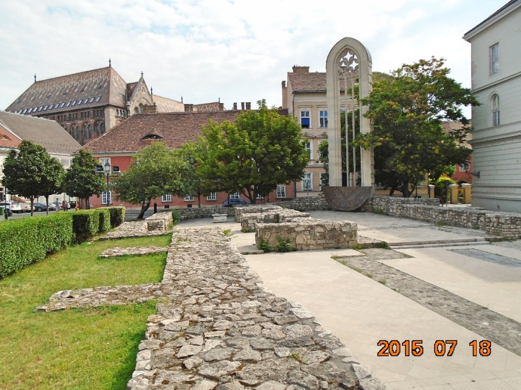 A templom egykori alaprajzát kőfalak jelzik. Néhány fénykép, megkeressük az emléktáblát és megyünk tovább.