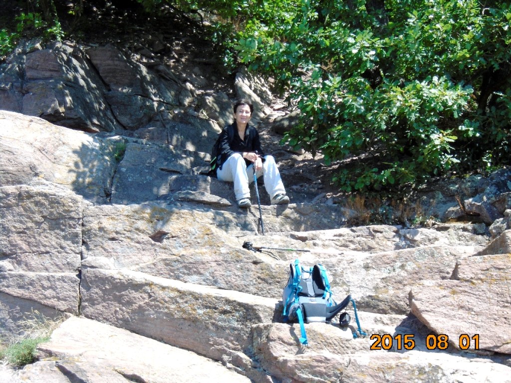 Szerencsére a hőség, az augusztus beköszöntével, enyhült. Átlagos nyári nap vár ránk. Korán indulunk, hiszen a Mecsek nem a szomszédunkban van. A vonattal pár átszállással, egészen Mecsekalja-Cserkút állomásig utazunk. Korábban már szálltunk le itt. Akkor a legrövidebb úton próbáltuk megközelíteni a Jakab-hegy felé vezető utat, de a 6-os úton való átkelés feladta a leckét. Percekig kellett az út mentén várakozni, mire kellő távolság keletkezett a mindkét irányú gépkocsifolyamban a biztonságos átkeléshez. Most az állomás előtti utat választjuk, mely a Pellérd felől becsatlakozó országútba torkollik. E mellett járda vezet a 6-os út felé. Az úttorkolat közelében autóbuszmegálló is van mindkét oldalon, így reméljük, hogy kijelölt gyalogátkelőhelyet is találunk, amely megkönnyíti az országos főközlekedési úton történő átkelést. Sajnos ebbéli reményeinkben csalatkozni kellett, mert az úttorkolat közelében, a kanyarodó sávok miatt, a 6-os út kiszélesedik, így gyalogátkelőhely felfestésére nincs mód. Tekingetünk jobbra-balra, hátha kissé távolabb, a buszmegállók miatt, akad egy zebra, de sehol semmi. Marad megint a kényszerű várakozás, míg a járműfolyamban lesz egy mindkét irányból biztonságos szünet. Kissé feljebb megyünk, ahol az út már csak kétsávos, ott könnyebb dolgunk lesz. Ahogy mondják, itt a túloldalra születni kell! Várakozás közben elgondolkodom, hogy milyen jó lehet innen iskolába, munkahelyre járni, mikor az ember a túloldali buszmegállóba szeretne eljutni a sietős reggeleken. Persze nem valószínű, hogy sok ember tenne így, mert a környék nem túl sűrűn lakott és feltehetőleg jó részüknek van gépkocsija is. Lassan sikerül átkelni az úton. Mivel nem akarunk a padkán visszagyalogolni a turistaútig, ezért a szemben lévő dűlőutat választjuk, mely a domb alsó szoknyáján telepített szőlőskerteken át vezet az erdőig, ahol egy ösvényen át elérhető a jelzett út. Eleinte még érdekesek a házak, melyek úgy lesznek egyre szerényebbek, ahogy haladunk felfelé. Itt már látszik, hogy ez a rész nem lakóterületnek, hanem inkább présházas, szőlőtermesztő területnek lett kialakítva. A szőlőt aztán felváltja az erdő. Az út hol meredekebb, hol lankásabb, de folyamatosan emelkedik, nem túl ingergazdag.