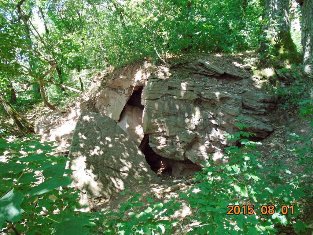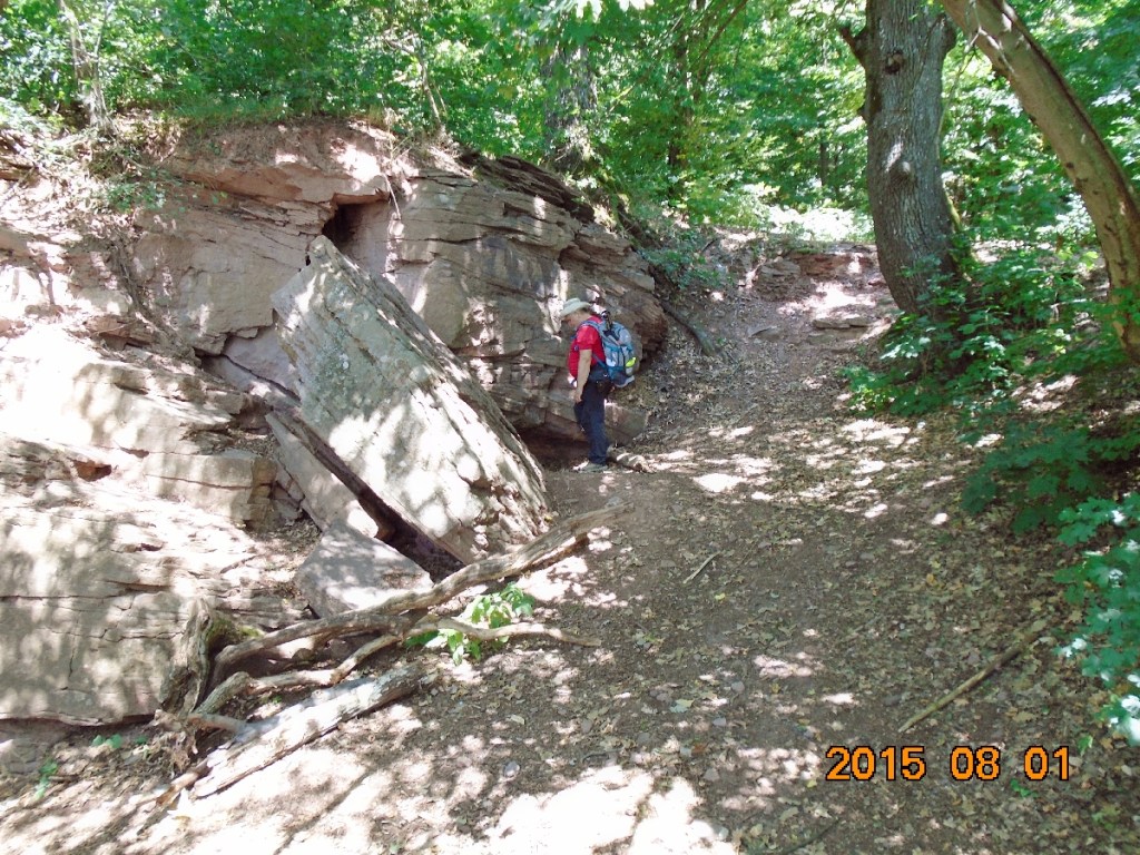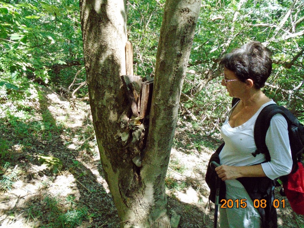 Ez már meredekebb, gyakrabban kell megállni, lihegni, pihenni. Ismét elmegyünk a fára épült ház mellett, melyet áprilisban nem vettünk észre. Most szemügyre vesszük, de elég elhanyagoltnak tűnik, különösebben nem érdekes. A lombok miatt még egy normális fényképet sem lehet róla készíteni. Egy valamikori avar földvár mellett megyünk el, de mára laikus szemmel, nem sok látszik belőle. Inkább csak a térképen követhető a vonala. Aztán már csak egy rövidebb nekirugaszkodás és fent vagyunk az egykori Pálos-kolostor romjainál, amit korábban már megtekintettünk. Most csak menet közben vetünk rá néhány pillantást és balra fordulva megyünk mai túránk első célpontjához, a Zsongor-kőhöz.