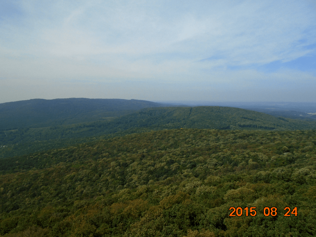 -gel jelölt ösvényre és pillanatokon belül előttünk van egy Magyarországon szokatlan kivitelű kilátóhely. Némileg a nemrégiben felkeresett Zsongor-kő kilátóhelyére hasonlít a kialakítása, de itt teljes egészében mesterséges építményről van szó. Nagyon tetszik, ez a lejtő fölé kinyúló megoldás.