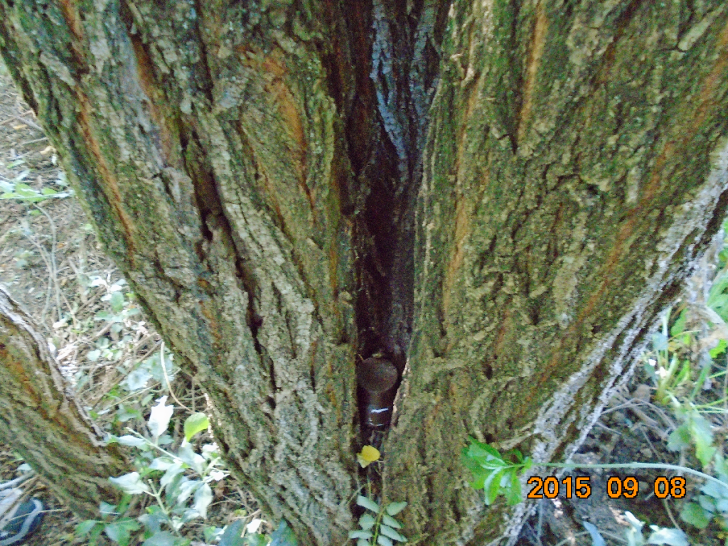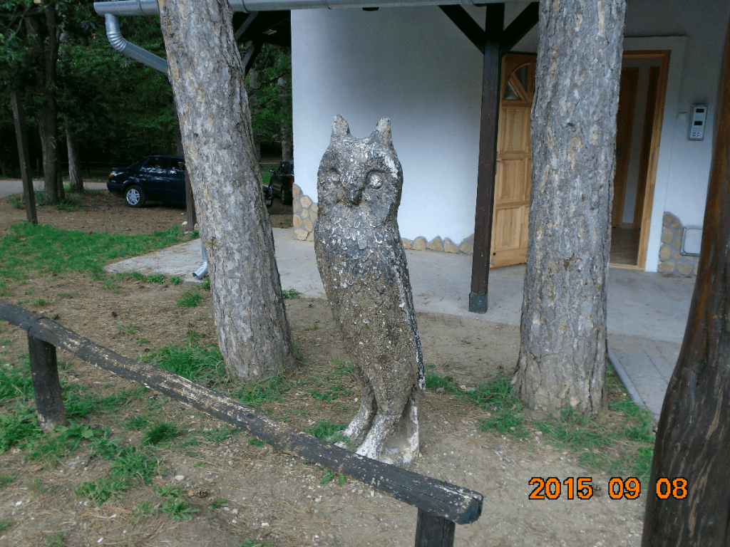 Logolunk, eltávolítjuk belőle az édességet, aminek az illata felkelthette az állatok érdeklődését, majd visszarejtjük a rejtekhelyére egy háromágú fa ölelésébe. Igyekszünk betakarni avarral, de a csomója elég nagy, szerintünk feltűnő. Mivel a leírás alapján ez az eredeti rejtek, így nem akarjuk áthelyezni. Nem is nagyon kínálkozik alkalmas rejtekhely a környéken. Továbbindulunk, miközben elmegyünk a Vadaspark étterme és parkolója mellett. Megcsodáljuk a faragott állatokat, melyek közül a bagoly tetszik a legjobban.