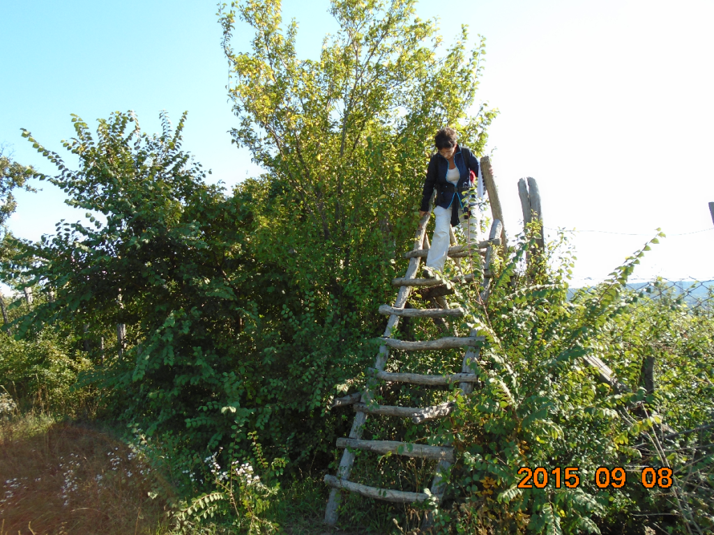 Útjaink során, ez már a többedik, létrával átjárható kerítés. Valószínűleg itt is az állatállomány elvándorlásának megakadályozása a cél. Kicsit azért aggódva nézek szét, mert a vadászidény megkezdődött. Szerencsére sehol sincs figyelmeztető tábla, meg közel is vagyunk a lakott területhez, így nem valószínű, hogy söréttel bélelik ki a hátsónkat. Innen egy ösvényen letérünk az útról az elhagyott bánya felé. Nagyon szép itt a környezet. Nem nagyon jár erre senki. Egy mohos szikla aljában meg is találjuk a ládát, egész gyorsan.