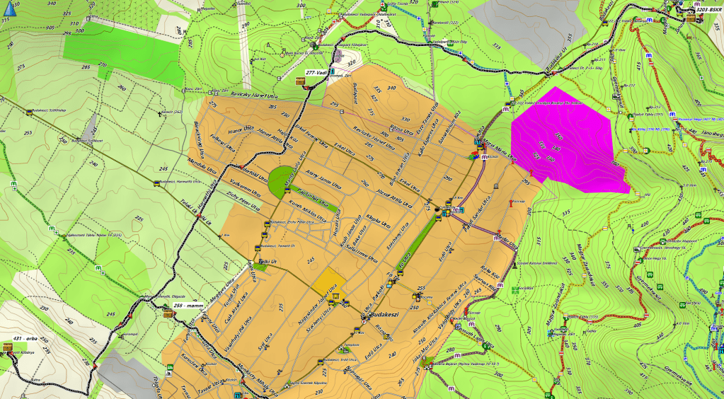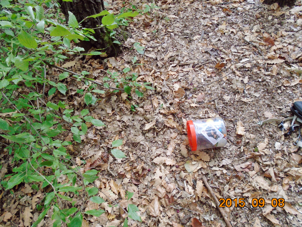 Végül Vé is felmászik hozzám és azon az úton, amerre jöttünk, távozunk is. Ismét következik a dzsungelharc, aminek a végére már minket sem lehet a vietkongoktól megkülönböztetni. A virágok hímporát alaposan szétszórtuk a területen. A dzsungelből kiérve, igyekszünk ismét a helyben honos fehérbőrűvé válni. Majdnem egészen a mamutfenyőkig, pontosabban a Mamutfenyő-elágazásig kell visszamennünk, hogy északkeleti irányba fordulva, folytathassuk utunk a következő geoládához. Ez a Vadaspark doboza. Mivel már elmúlt dél és a Vadaspark megtekintése hosszabb időt vesz igénybe, most csak a ládáját keressük meg. A Vadasparkra majd rászánunk egy egész napot. Eleinte a Budakeszi mellett elterülő mezőn át vezető földúton ballagunk, majd a település utcáin kanyarog utunk. Kiérve a házak közül, erdőbe érünk. Itt már közel a láda, amit a rejtekén kívül, a földön találunk. Valami állat túrhatta ki? Szerencsére ép.