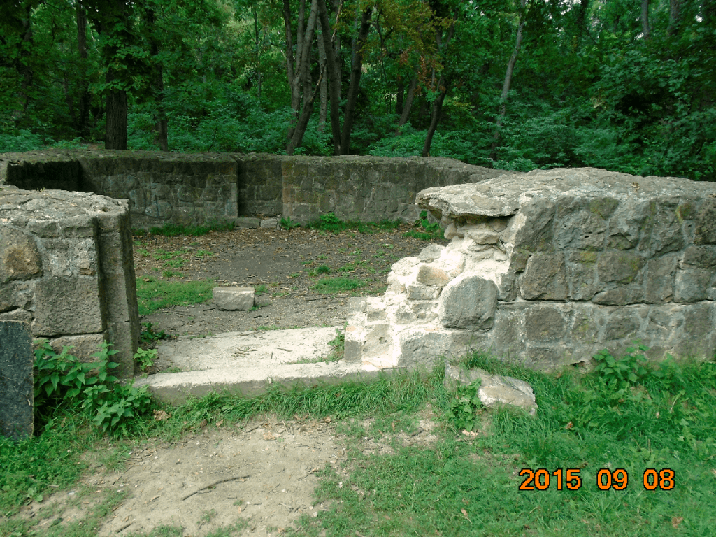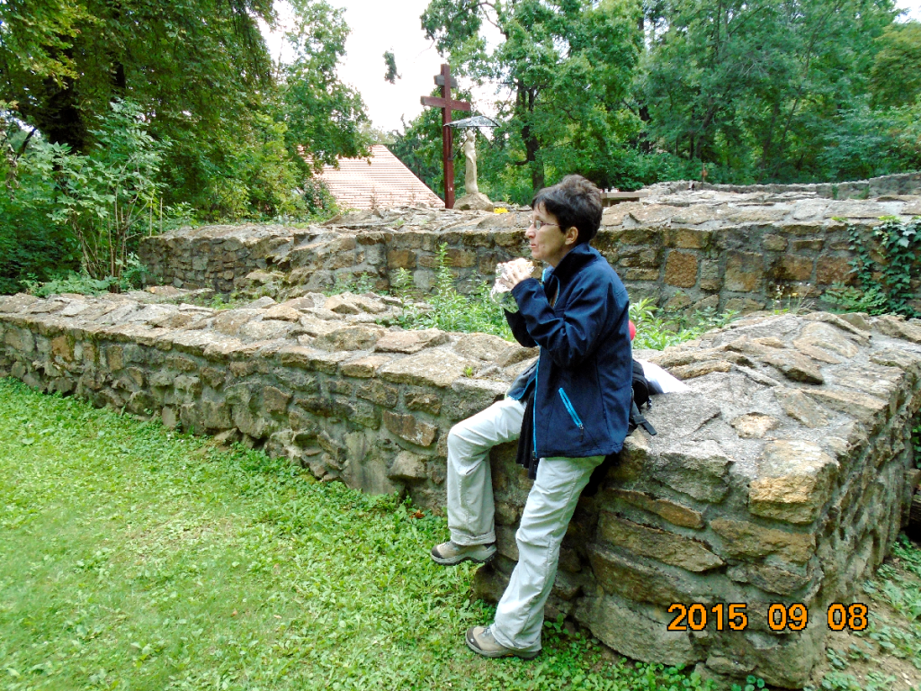 Közben már az éhség is kerülget bennünket, így megesszük a szendvicsünket. Sajnos padokat nem raktak e pihenőnek is alkalmas helyre, ezért úgy félfenékkel a falmaradványoknak támaszkodva falatozunk.